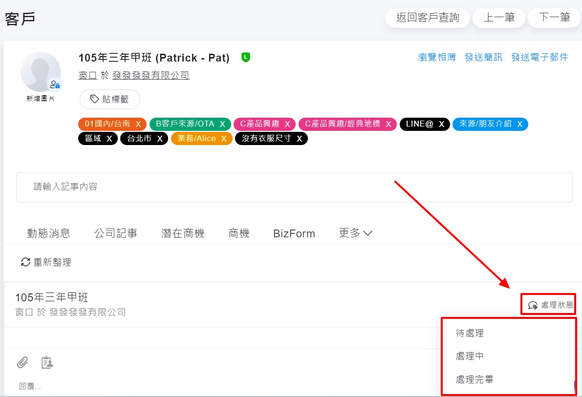 點擊「處理狀態」後,可以選擇要將此客戶標記為「待處理」、「處理中」或「處理完畢」。目前「處理狀態」僅支援此三種選項,暫不提供新增或自訂其他狀態類型。