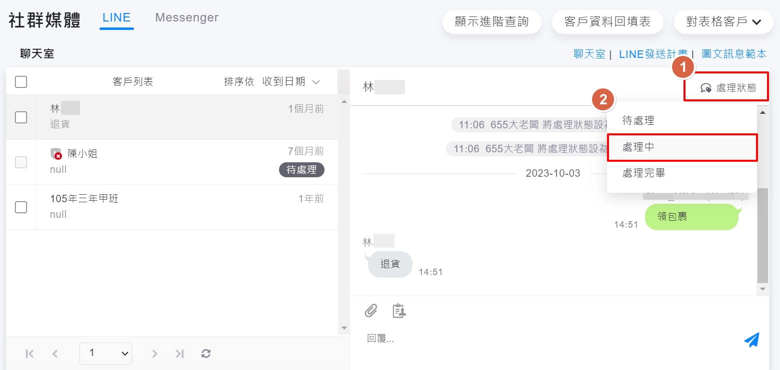 在聊天室右上方加入了「處理狀態」區塊,可以為 LINE 客戶標記處理狀態。