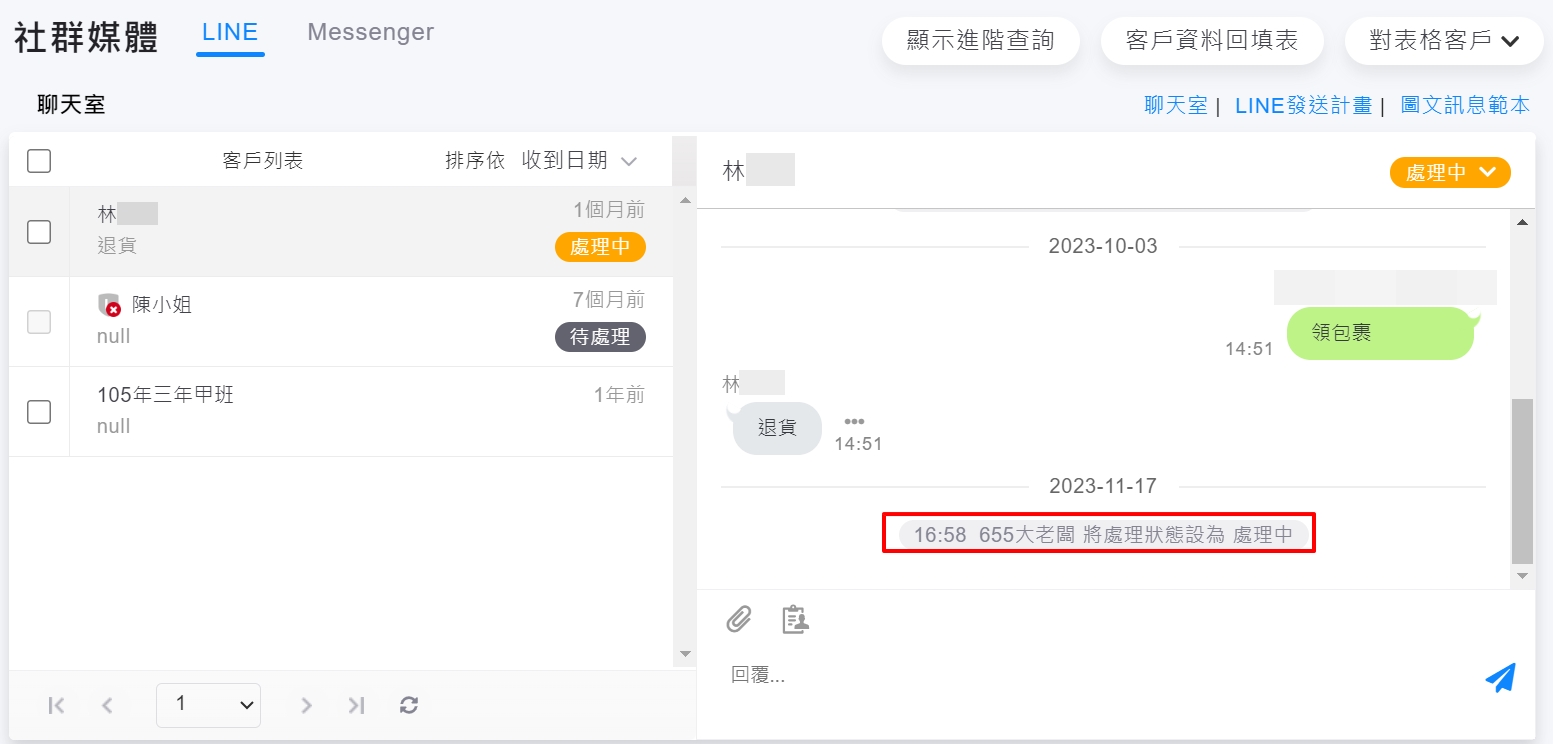 設定狀態後,可以在聊天室看到一則系統訊息(此訊息屬於事件記錄,不會實際發送給客戶,僅在 CRM 聊天室可見),列表內此客戶的狀態也會跟著改變。