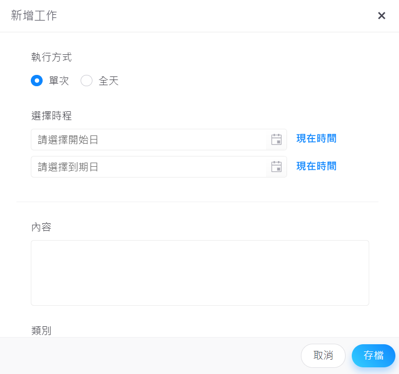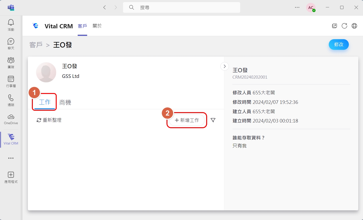 於客戶詳細資料畫面,點擊【工作 > +新增工作】加入 CRM 的工作事項。