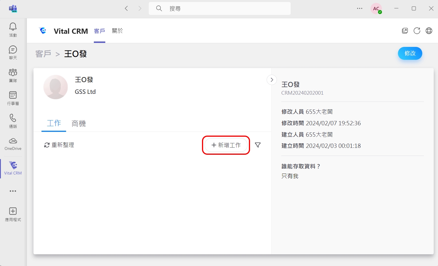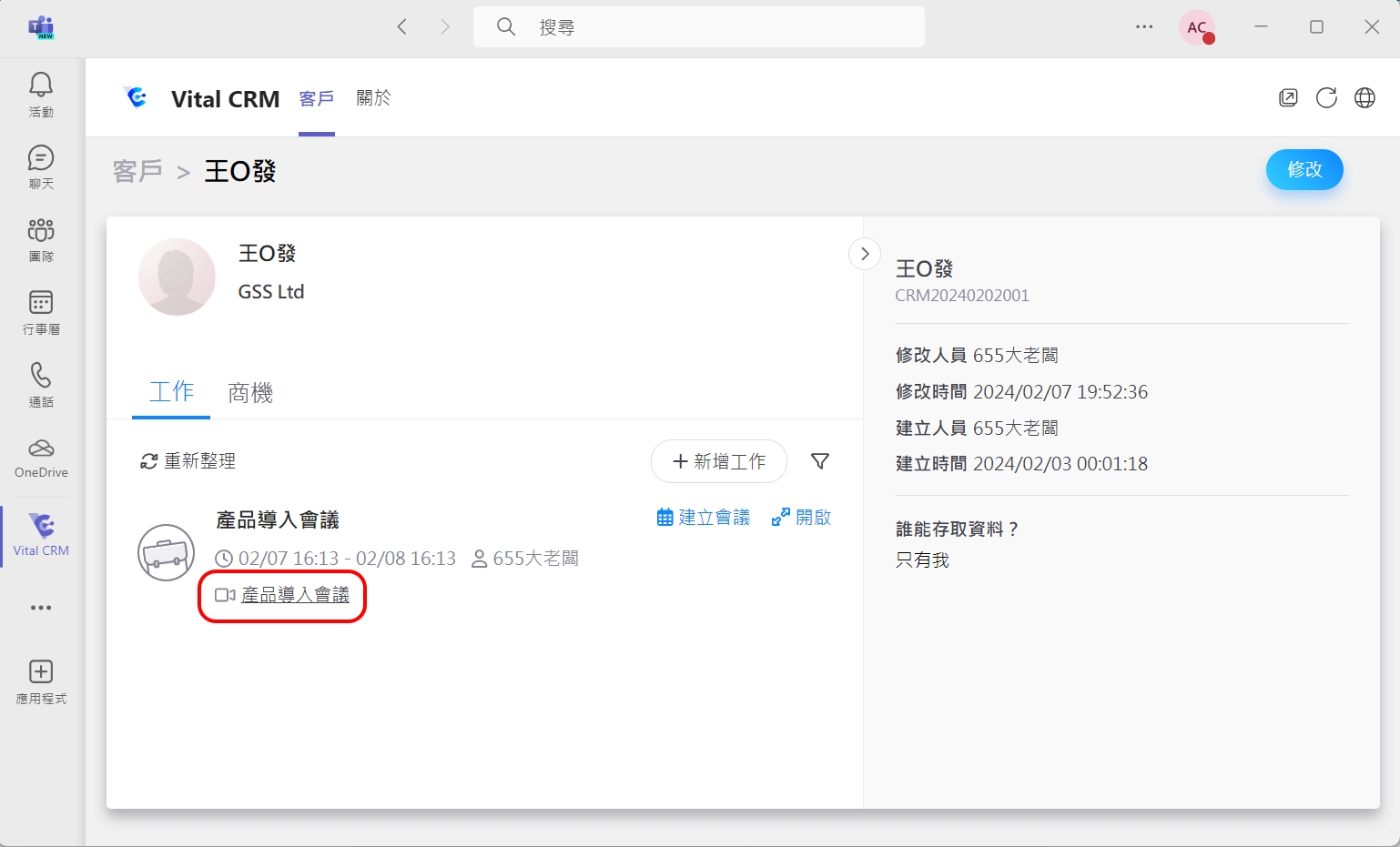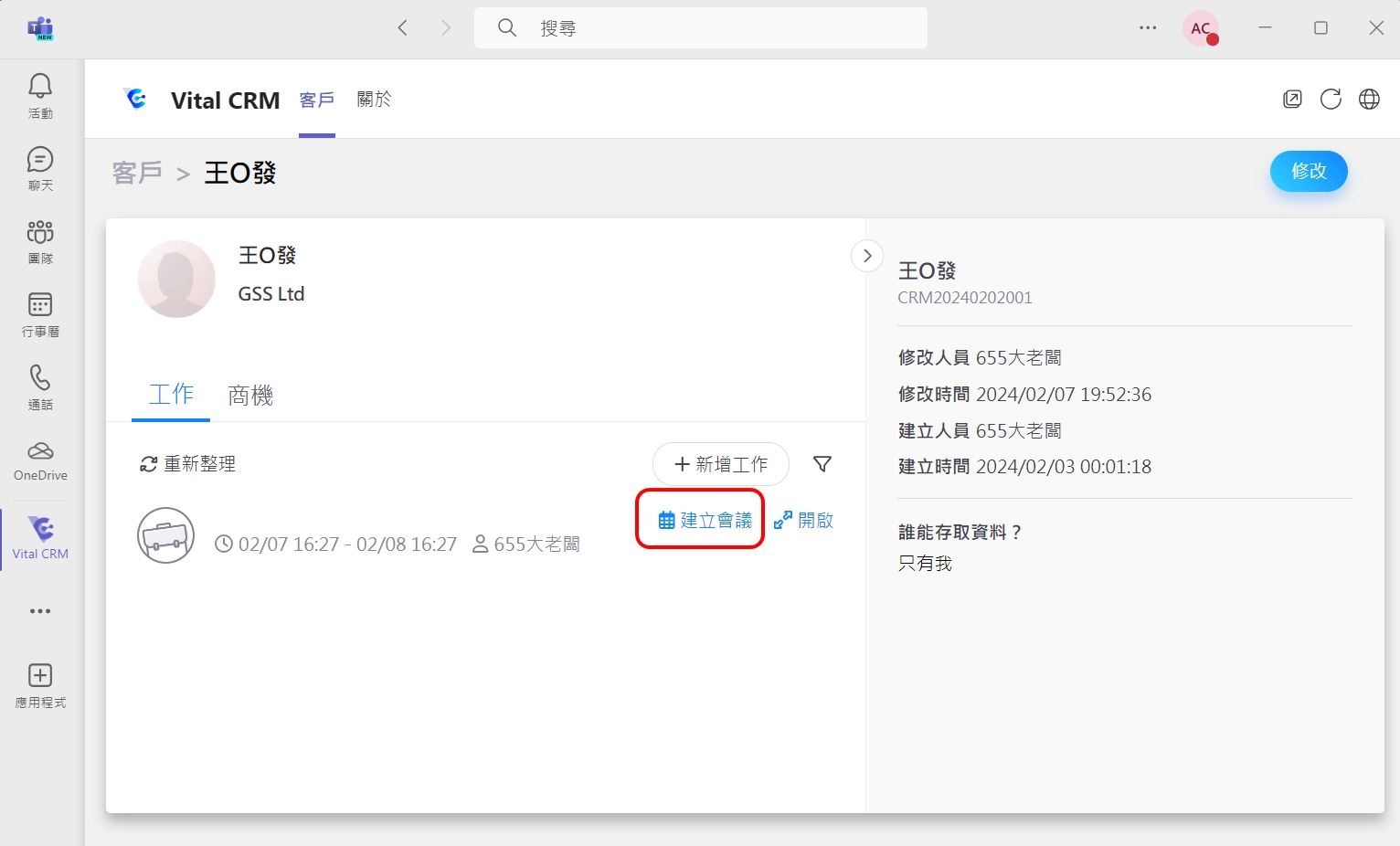 若新增工作存檔時,選擇【取消】不加入會議,也可以在要加入會議的工作點擊【建立會議】,即可將工作加入會議。