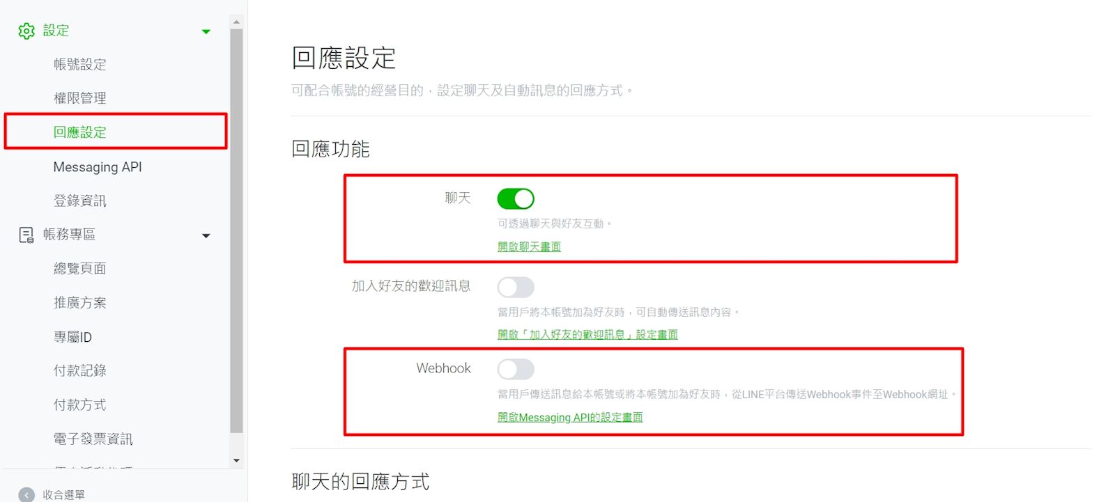 請至 LINE 後台的【回應設定】中,將回應功能調整為「聊天」,並將 webhook 停用即可。