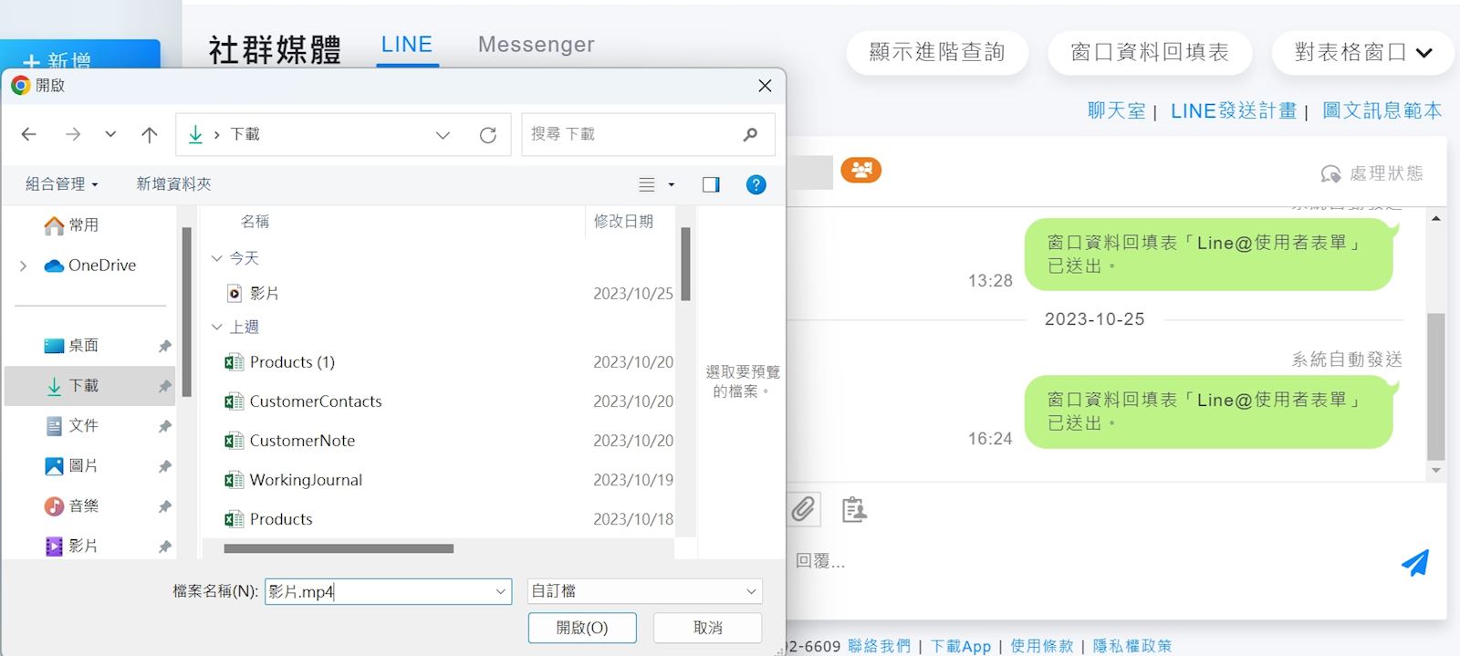 目前LINE@模組在發送附加檔案功能中,除了圖片檔,也能看到mp4類型的影片檔。