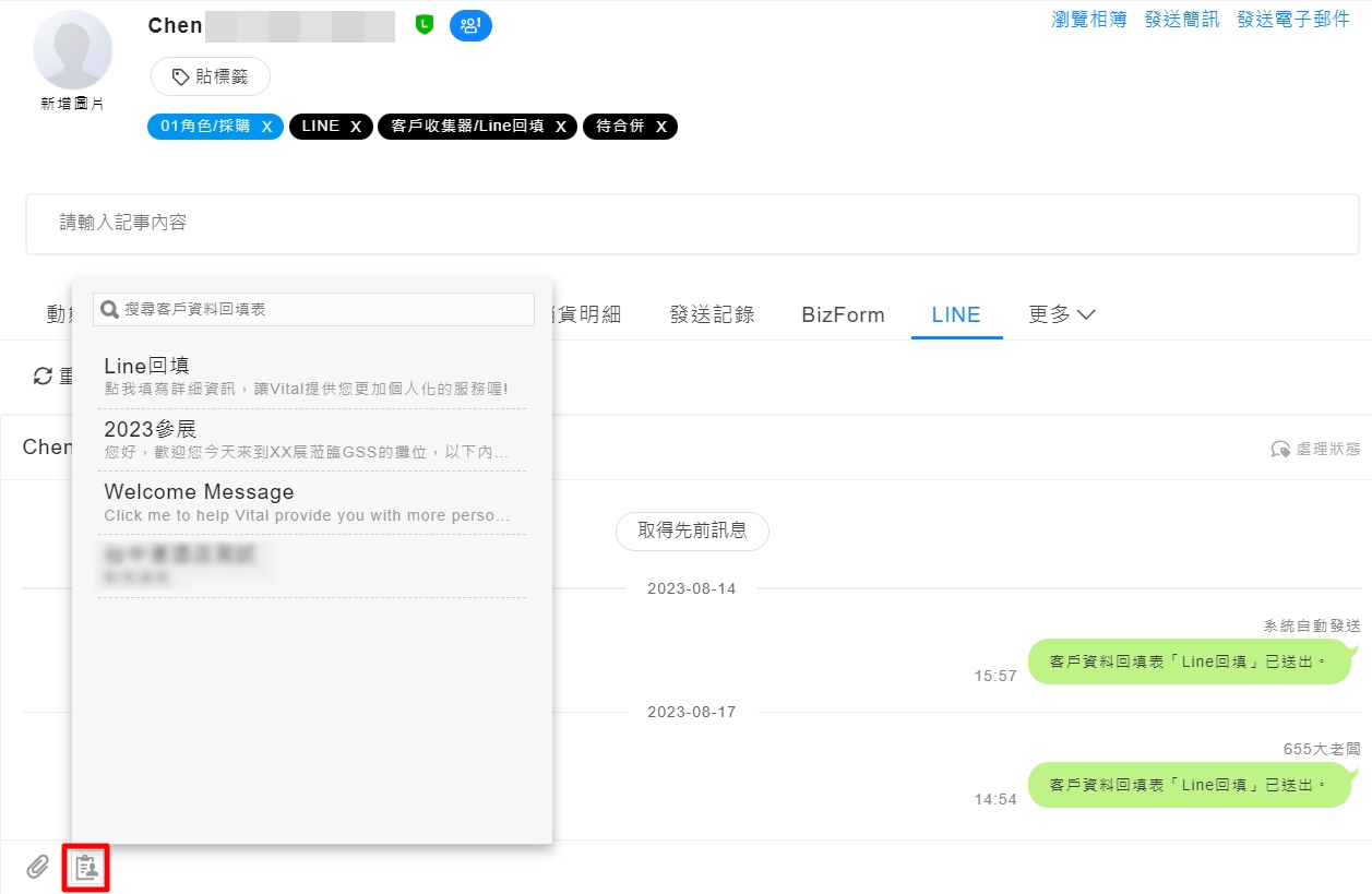 客戶詳細資料畫面,LINE@頁籤內的一對一聊天,也有提供發送回填表的功能