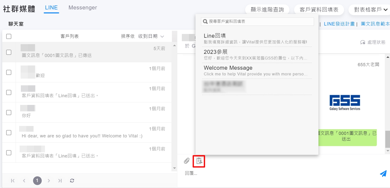 LINE@聊天室有一個發送客戶資料回填表的按鈕(如下圖),可以在與客戶對話時發送資料回填表,點擊按鈕後可以選擇要發送的回填表,且可以使用關鍵字查詢。