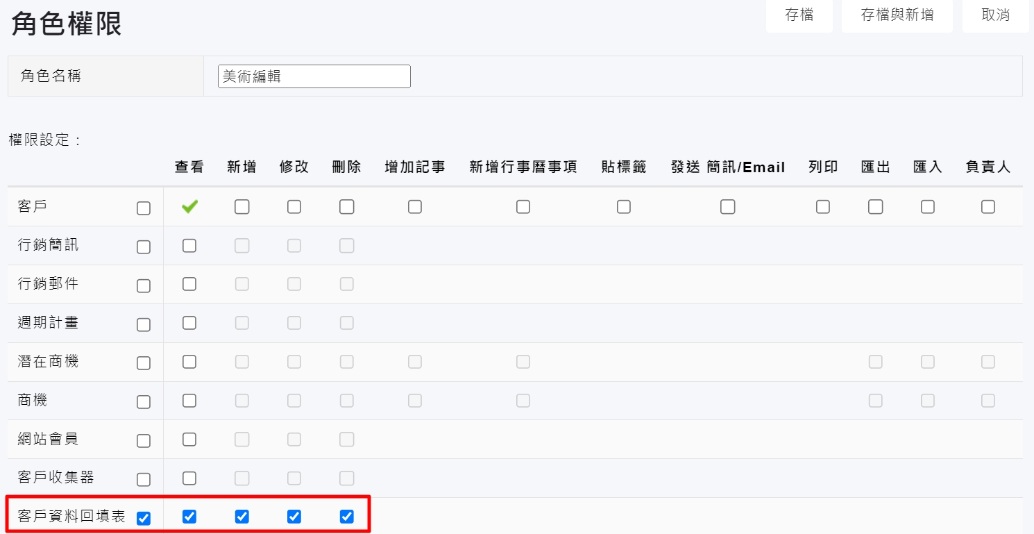 可以,請系統管理員先至【管理>帳號>角色權限】中開放「客戶資料回填表」的權限給所需的角色,再將其角色套用至相關使用者的帳號中即可。使用者即可在【社群媒體】功能頁中操作客戶資料回填表。