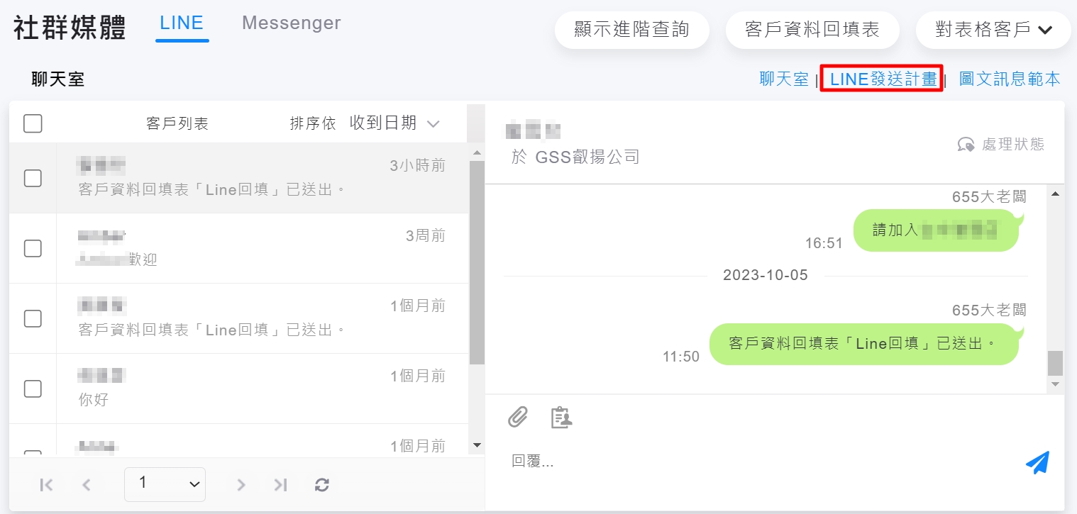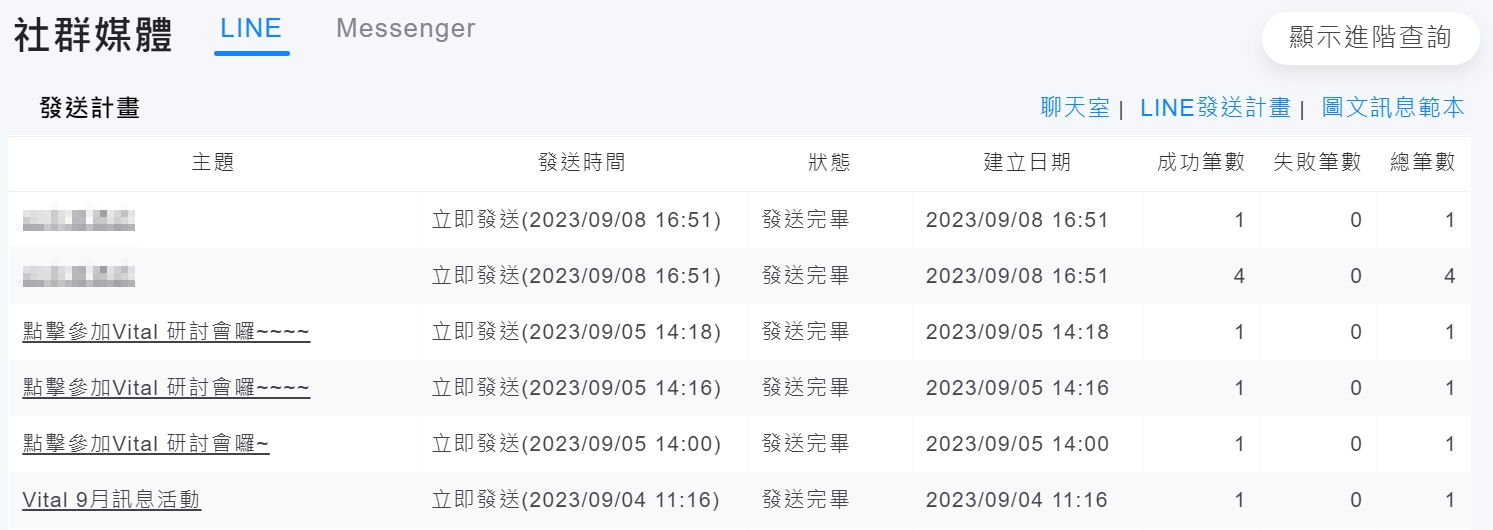 於CRM的社群媒體LINE畫面右上方,增加了「聊天室」與「LINE發送計畫」的切換按鈕,請點擊「LINE發送計畫」,使用Vital CRM內的LINE群發訊息功能後,可以查看發送記錄。
