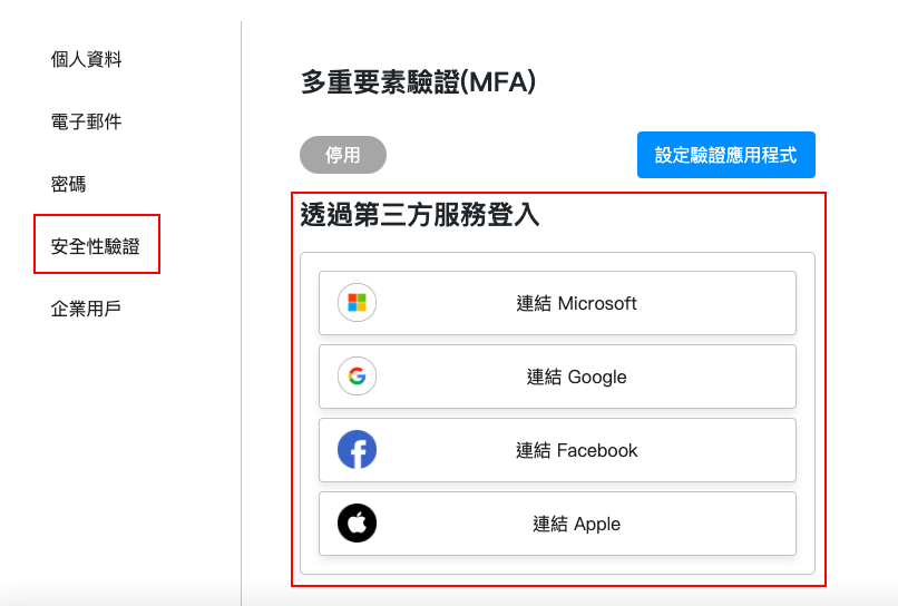裡面會看到「透過第三方服務登入」,可查看自己綁定的情況,如果沒有綁好,請再次連結,如果有顯示已綁定,請解除之後重新再連結一次