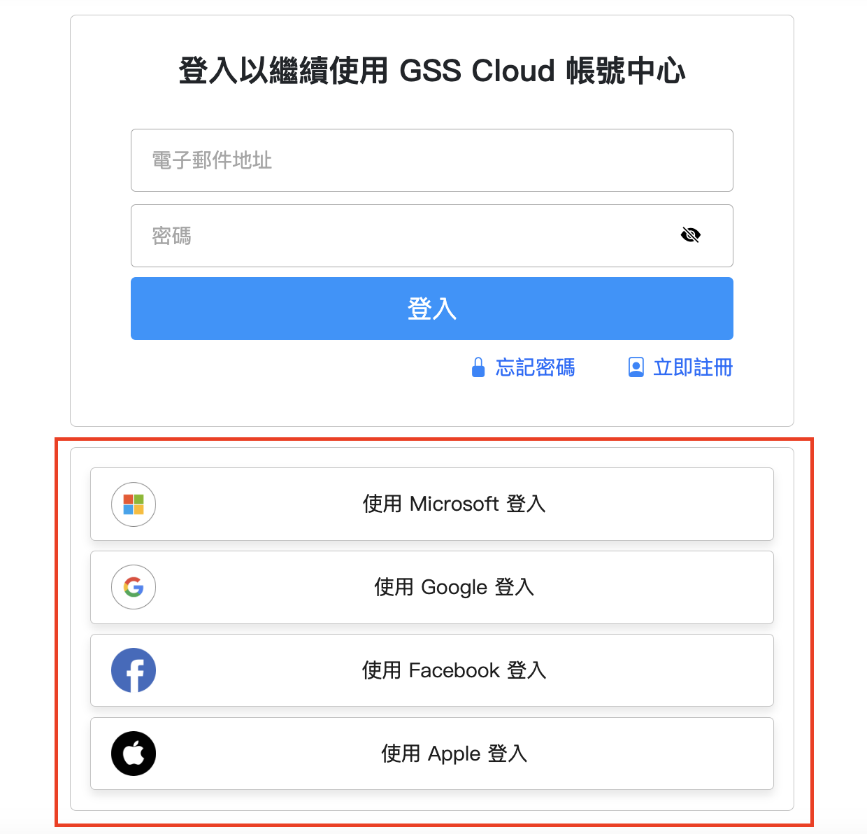 若您的帳號已經符合以上條件,在登入時,即可直接在登入畫面選用您所綁定的第三方服務帳號