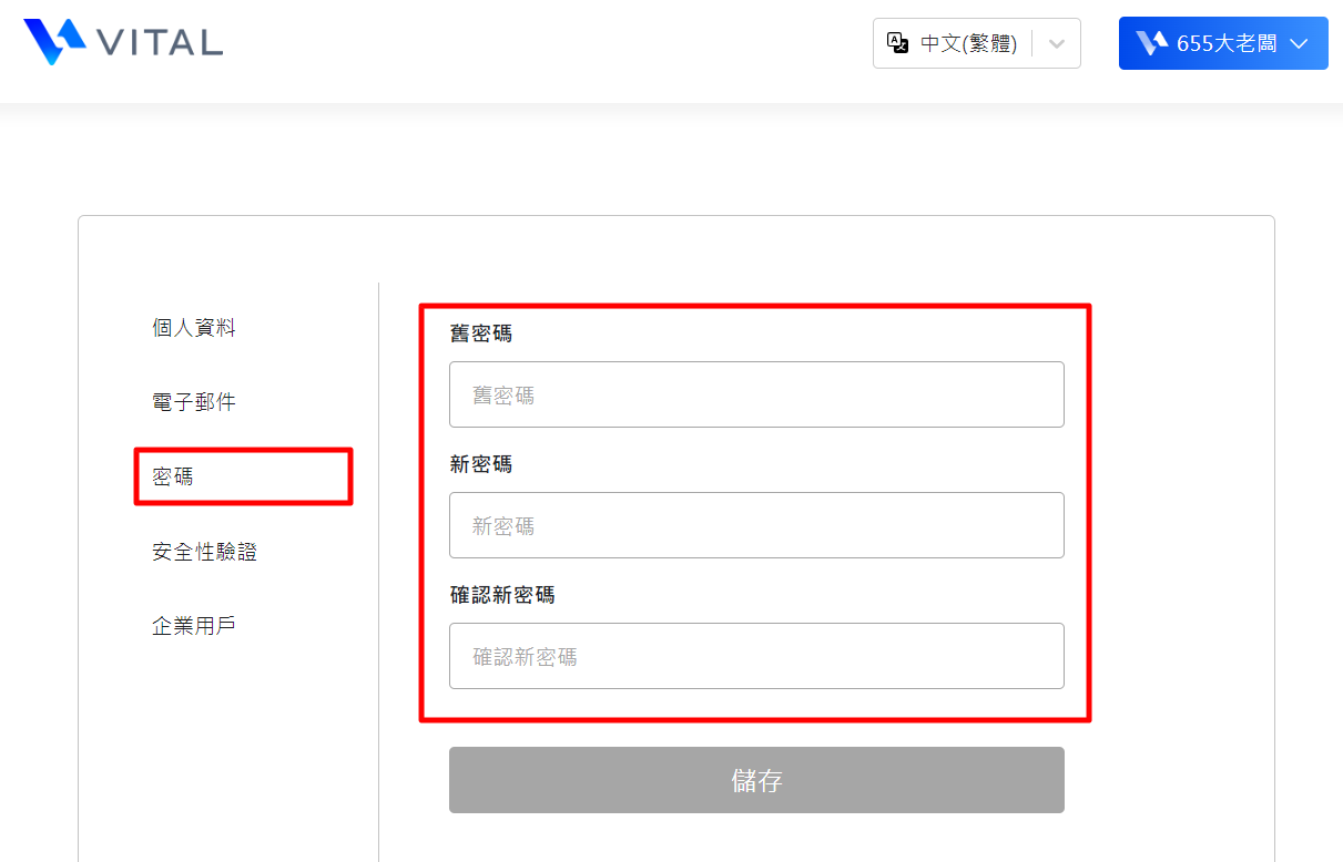 3. 進入帳號中心後,可於左方選單中選擇【密碼】修改密碼,修改完成記得按下「儲存」鈕。