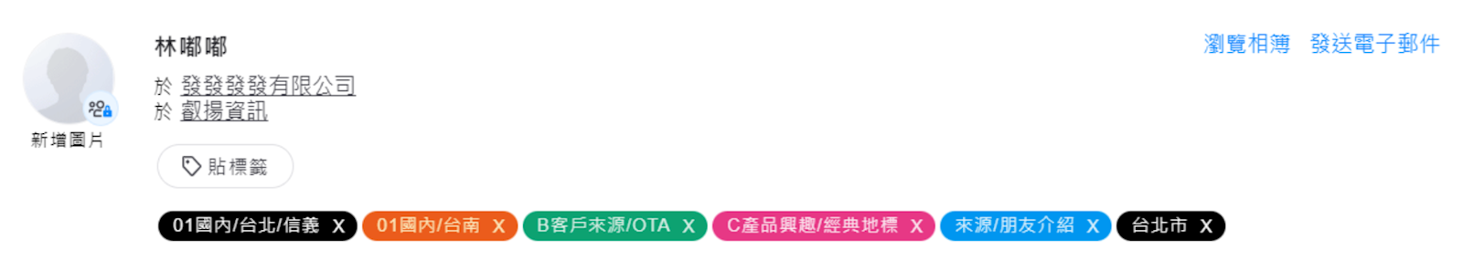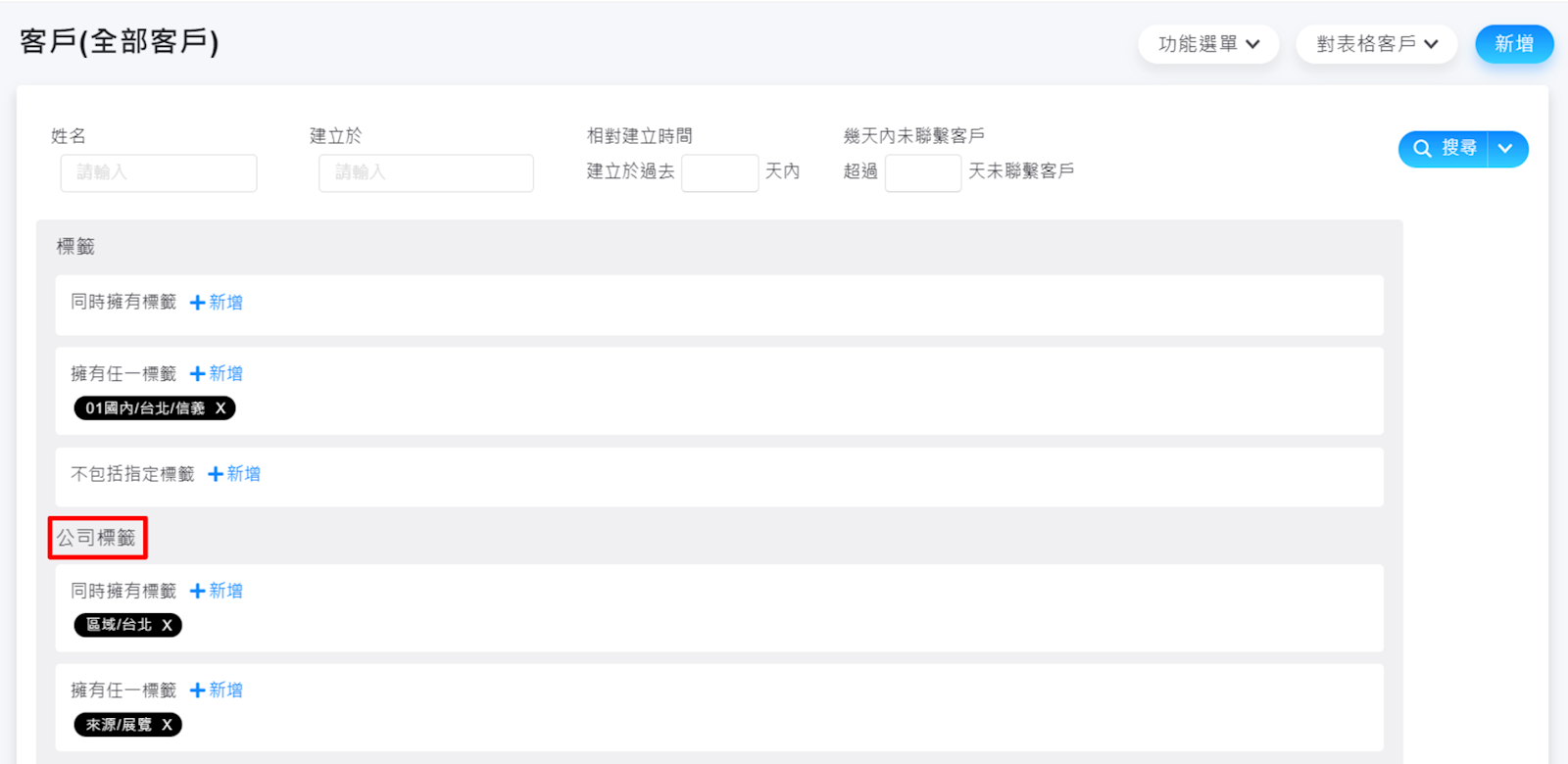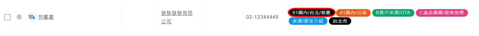 以客戶和公司標籤條件過濾,可以精確地找出完全符合的公司成員,以下圖為例:該公司同時擁有【區域/台北/信義】,且屬於【來源/展覽】任一指定標籤。