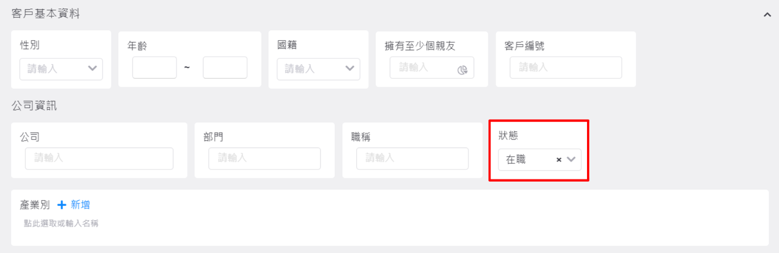 | 在客戶列表的查詢畫面中,使用【公司標籤】的過濾條件,可以查詢出公司資訊符合標籤條件的所有客戶,且在有輸入公司名稱的情況下,可以查出該公司在職或離職人員。
