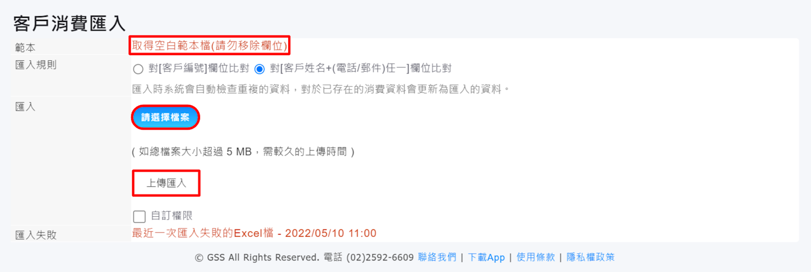 2. 請於消費匯入畫面下載空白範本:【消費>消費匯入>取得空白範本檔】。