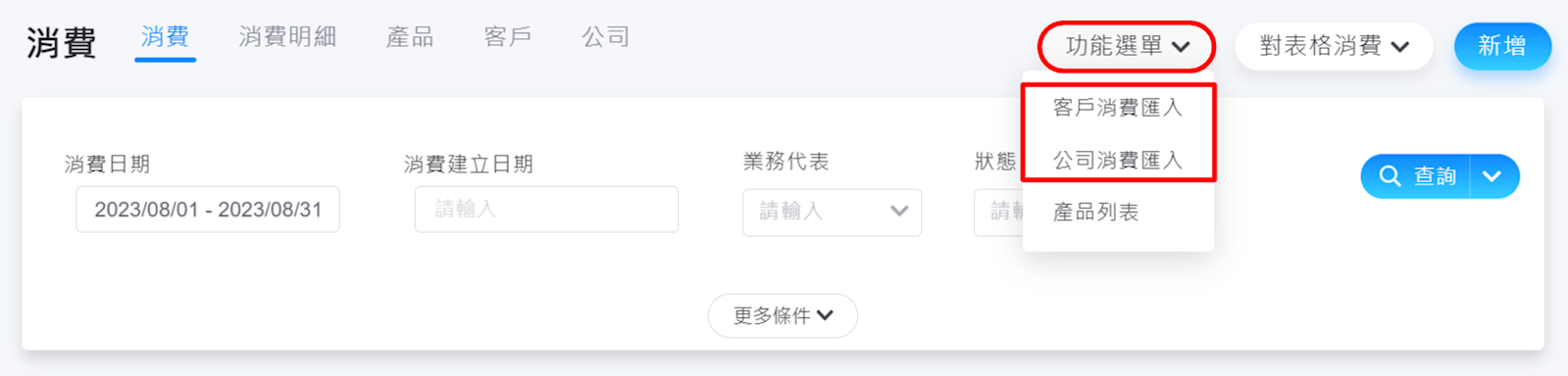 1. 請至列表左下方【消費>功能選單>客戶消費匯入、公司消費匯入】。