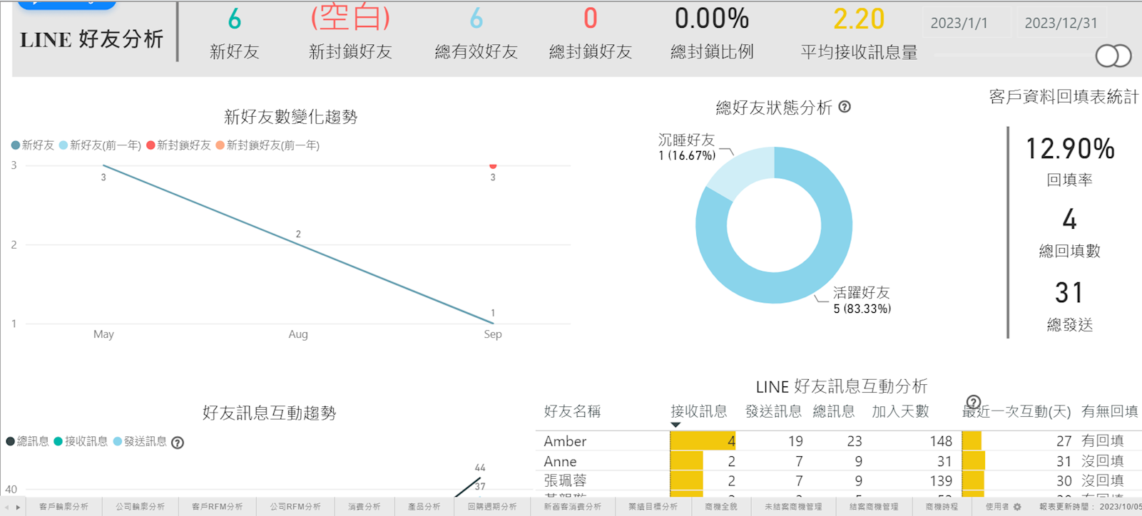 Vital CRM 提供和 LINE 官方帳號整合的功能,讓企業可以匯流LINE 好友於CRM系統內,並提供一對一溝通和精準群發個人化訊息的功能。為了讓企業更了解 LINE 官方帳號的經營成效以及和好友互動狀況,新增了「LINE 好友分析」的主題。如下圖所示,該主題提供 LINE 好友狀態如封鎖、活躍、沉睡的分析,訊息來往互動趨勢分析以及客戶資料回填的統計。