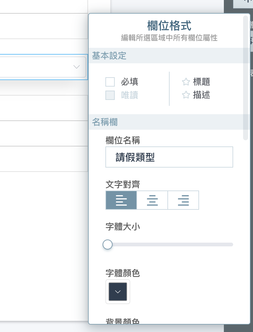 4. 點選後,即會出現欄位格式的修改畫面,可以修改欄位名稱、對齊方式、字體大小與顏色、欄位屬性、設定預設值、加入指引文字等等。