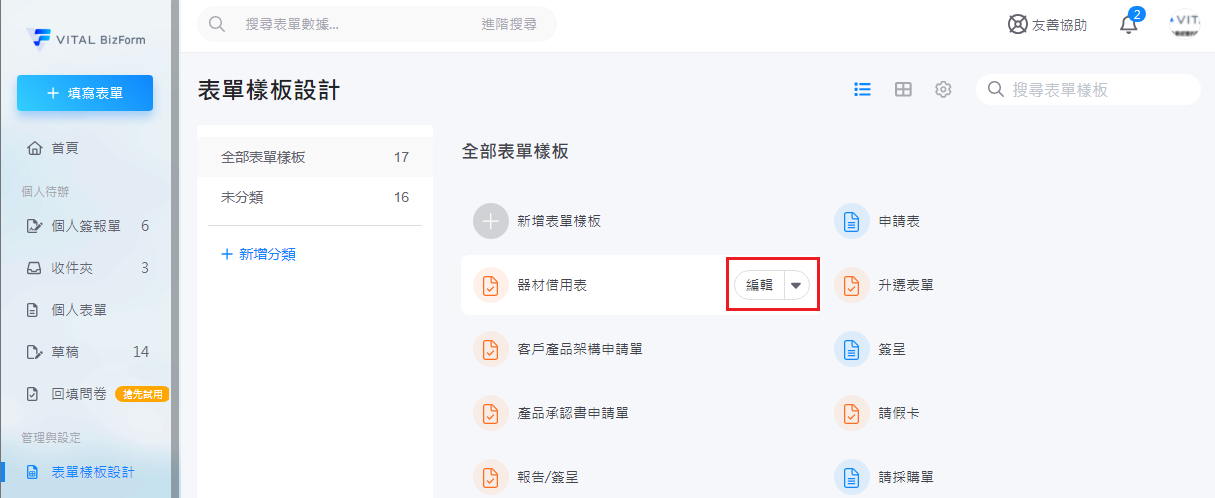 2. 點選【新增表單樣板】建立一個新樣板;或在欲修改的表單上點選【編輯】。