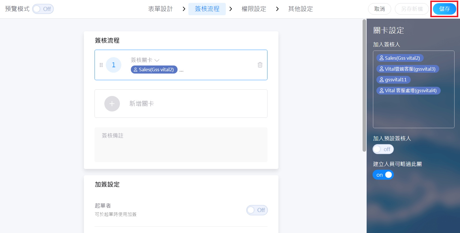 進入表單編輯畫面後,點選畫面上方的【簽核流程】開始【新增關卡】。