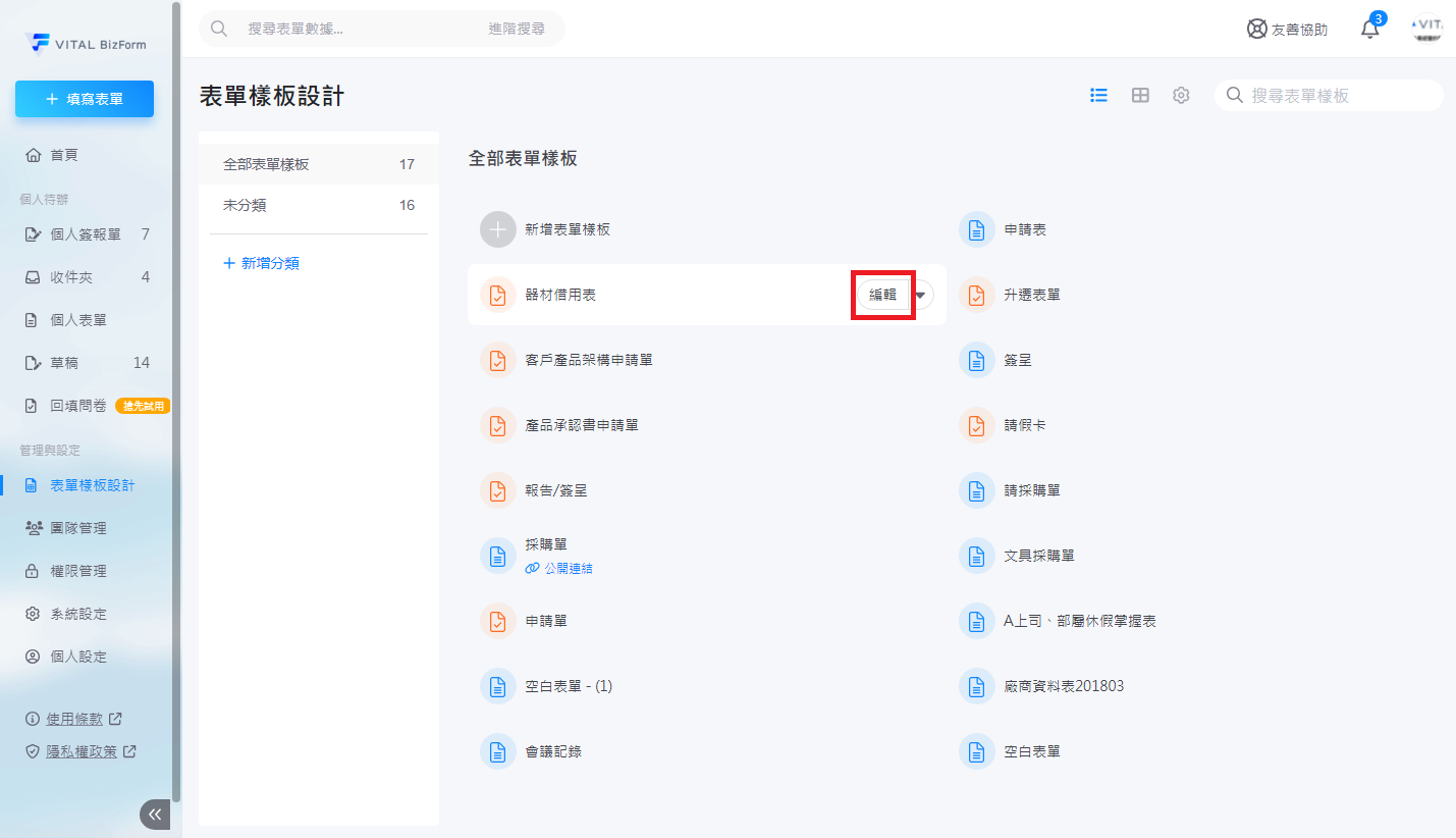 若既有表單要新增簽核流程,請點選左側【表單樣板設計】,在表單上點選【編輯】。