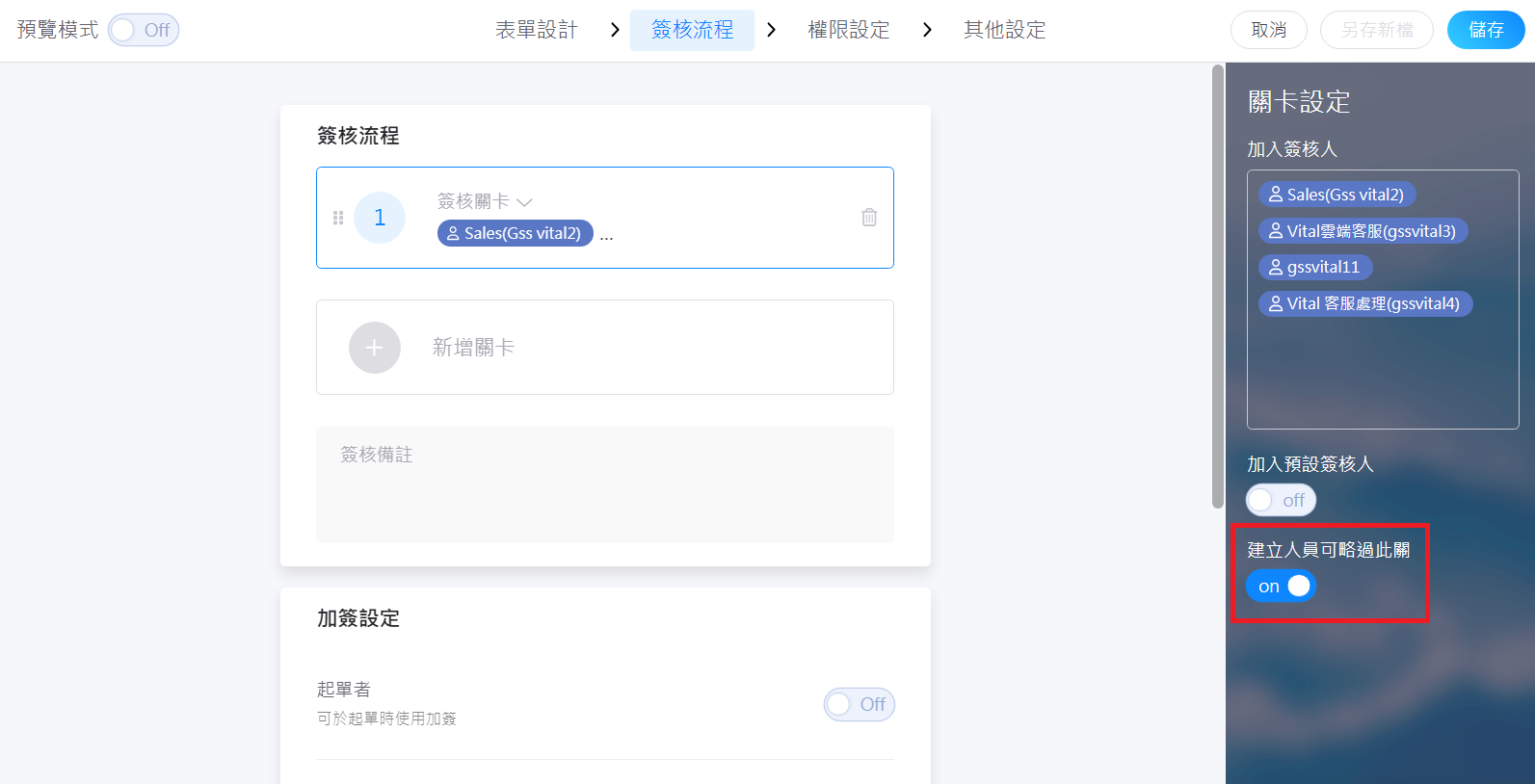 若是此表單可以讓填單者跳過某關卡,您可以開啟【起單者可略過此關】。