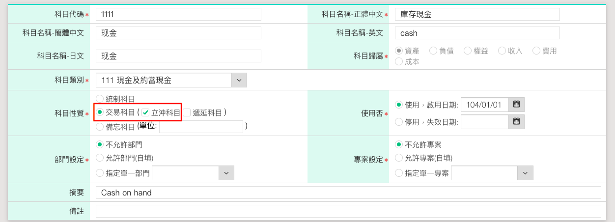 2. 在「維護作業/科目資料/會計科目」,選擇或者新增會計科目時,如果該科目須要做立沖帳,則請勾選「立沖」。