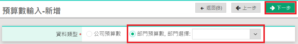 3. 請選擇「部門預算數」並選擇部門後,繼續「下一步」。