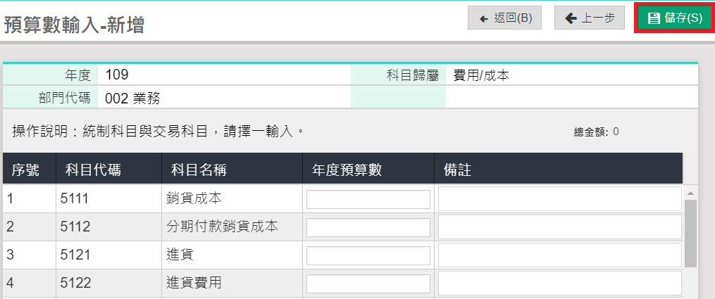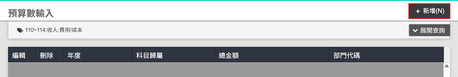 若要新增部門預算數,請點選系統路徑:【日常作業>預算數輸入】。