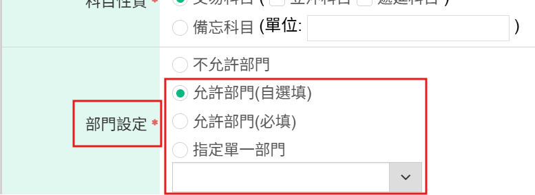 2.會計科目請必須勾選「允許部門(自填)」如果每個會計科目都需要下拉部門,就必須逐一設定會計科目