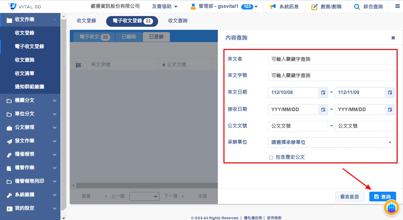 您可以於【收文作業>電子收文登錄】中點擊「已登錄」頁籤,並利用右上方的「查詢」按鈕,依條件篩選公文。