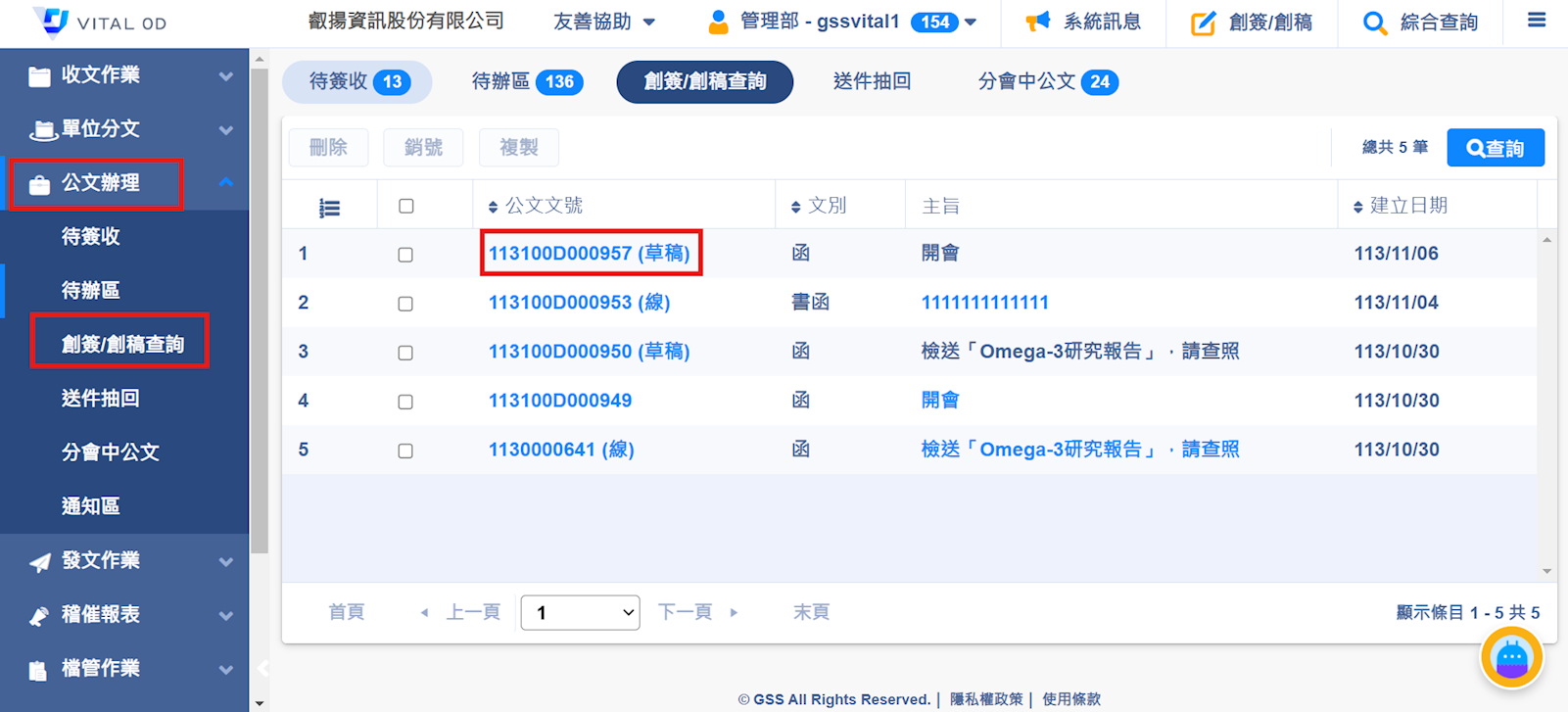 創簽稿存檔後,會在【創簽/創稿查詢】裡存成草稿。