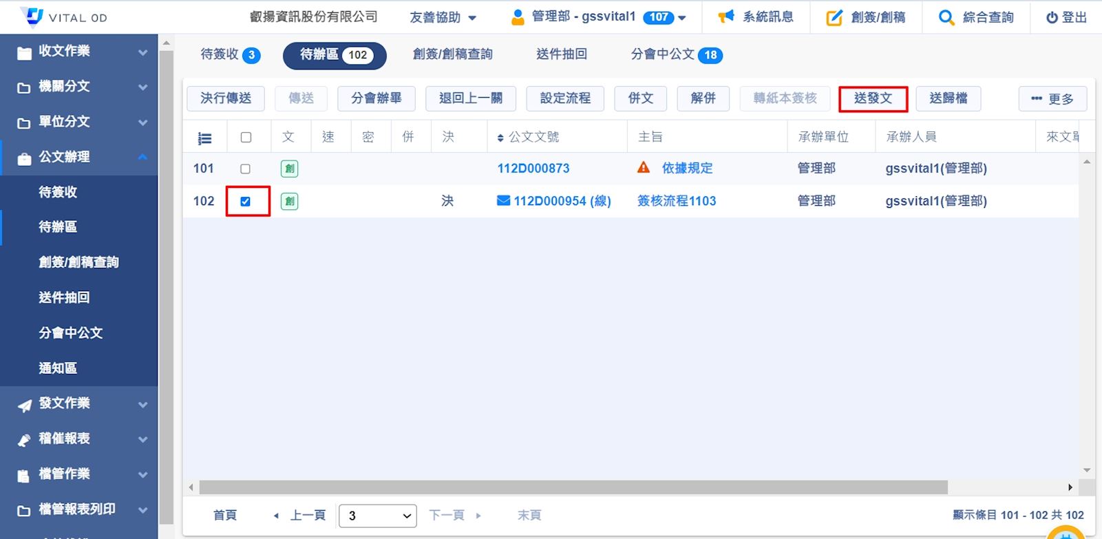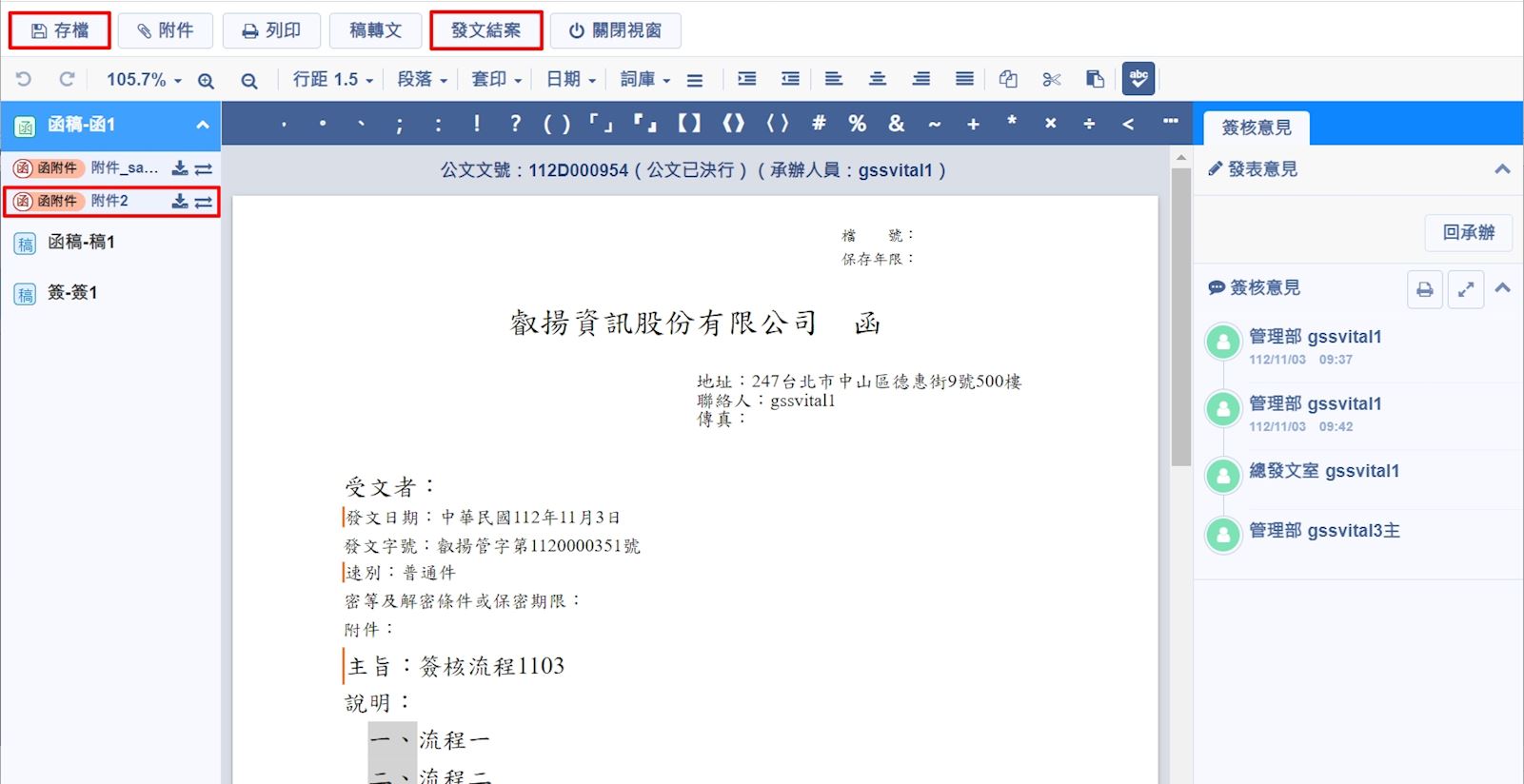 第二,是將該公文【送發文】給發文人員,發並將函附件提供給發文人員夾帶為發文附件