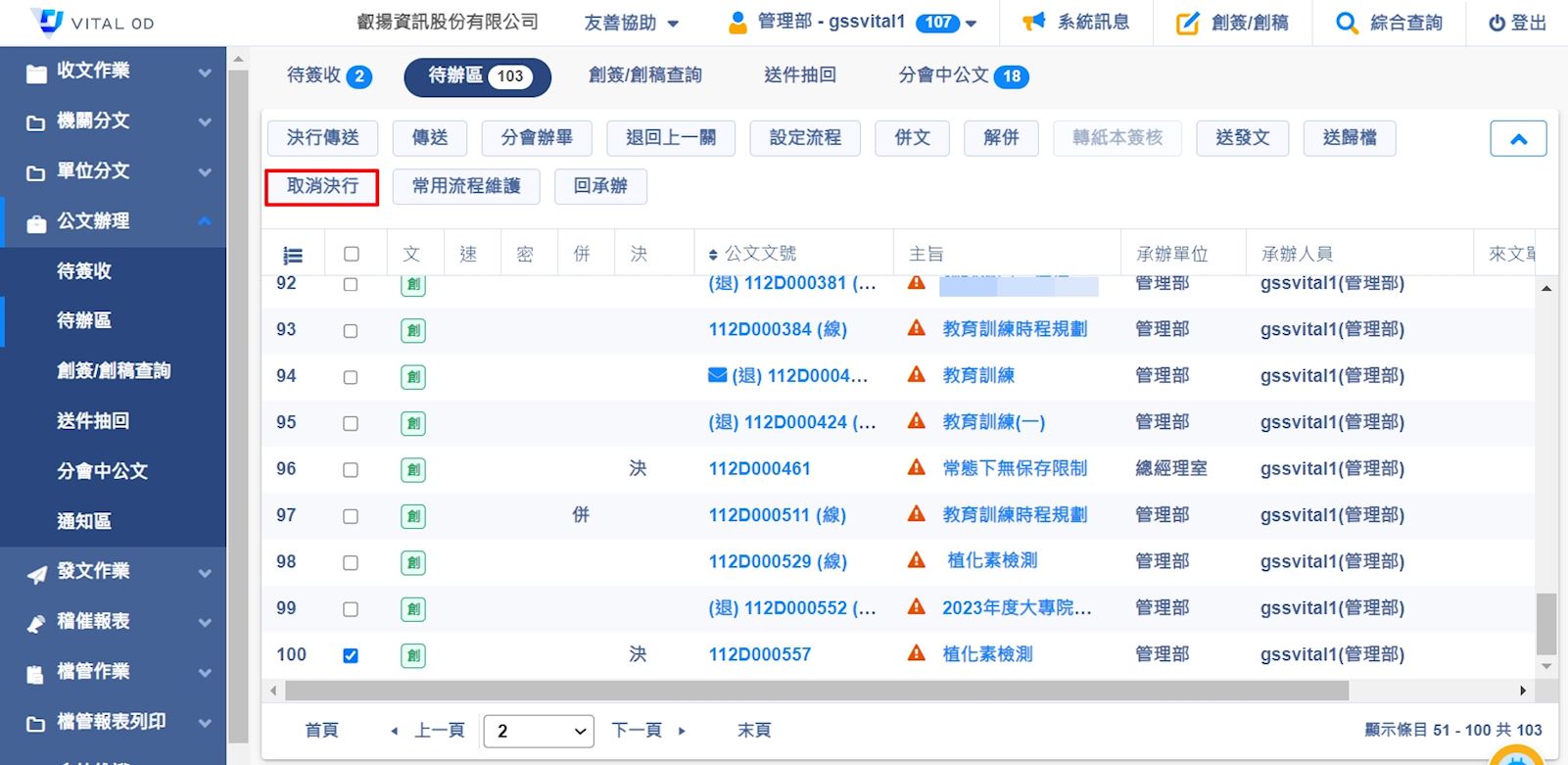 第一,您可以【勾選】您要編輯的公文點選【取消決行】