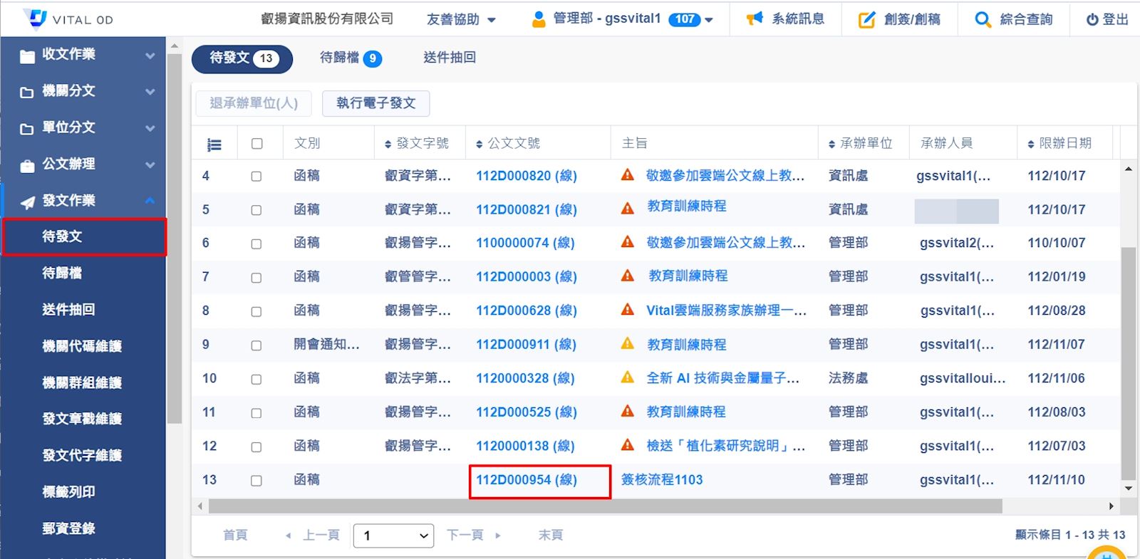 發文人員到【發文作業>待發文】,找到需要夾帶發文附件的公文點選【公文文號】進行進行夾帶附件
