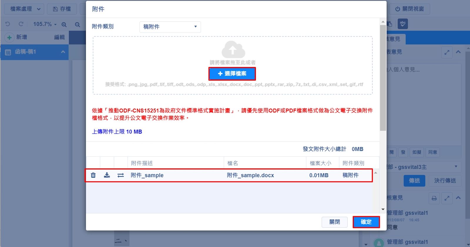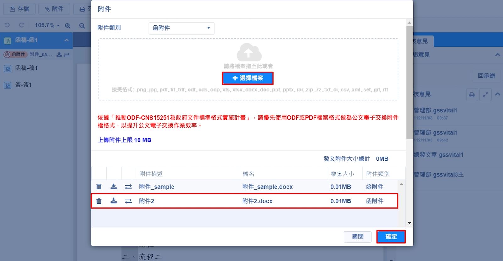 進入附件視窗,點【選擇檔案】重新將公文夾帶發文附件再按【確定】