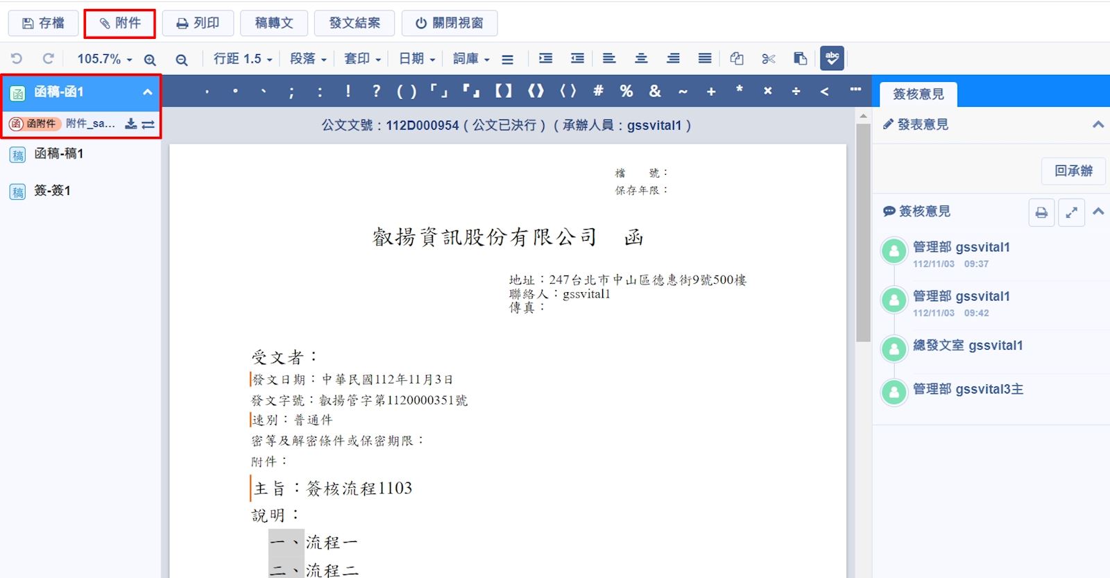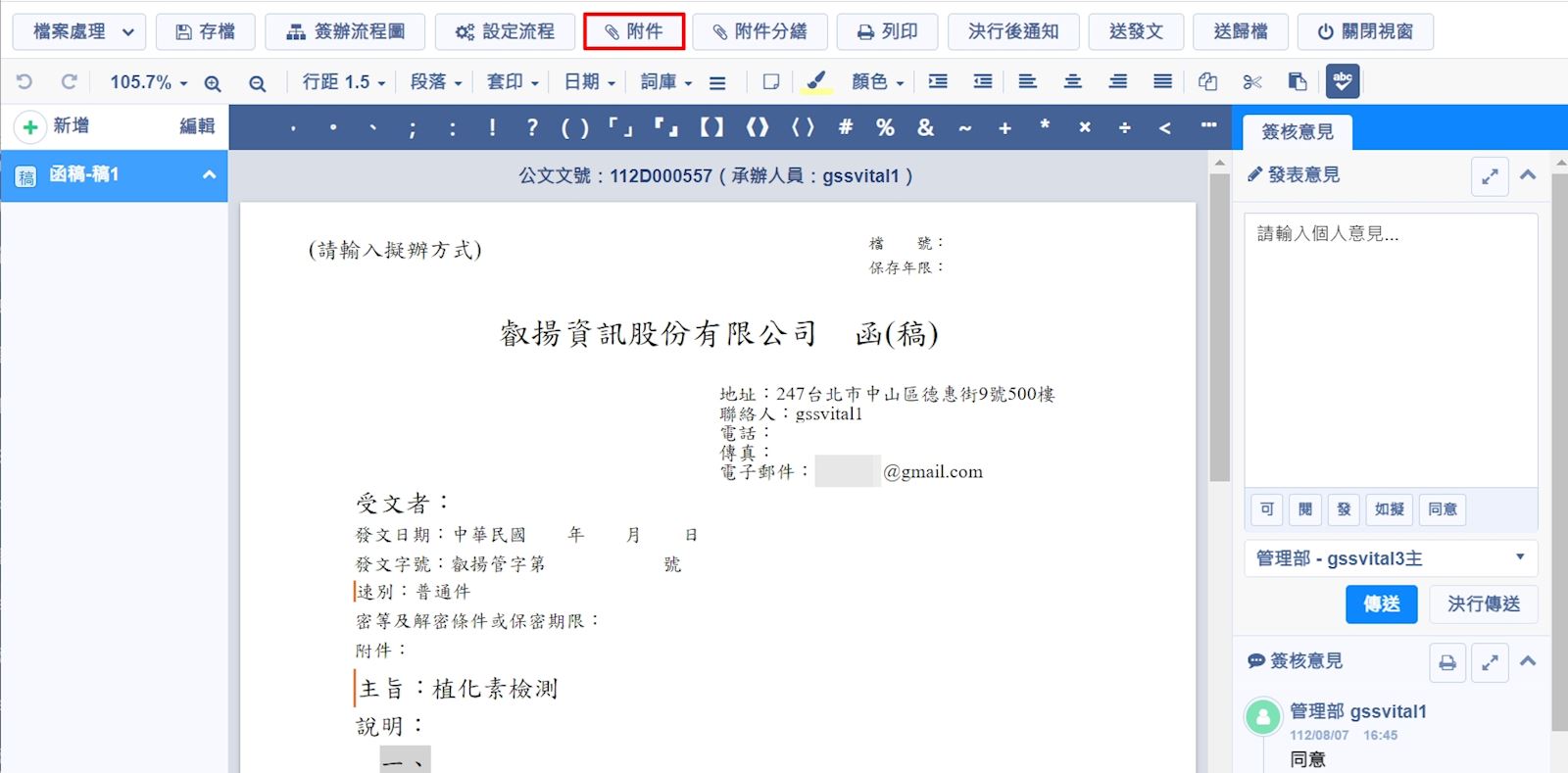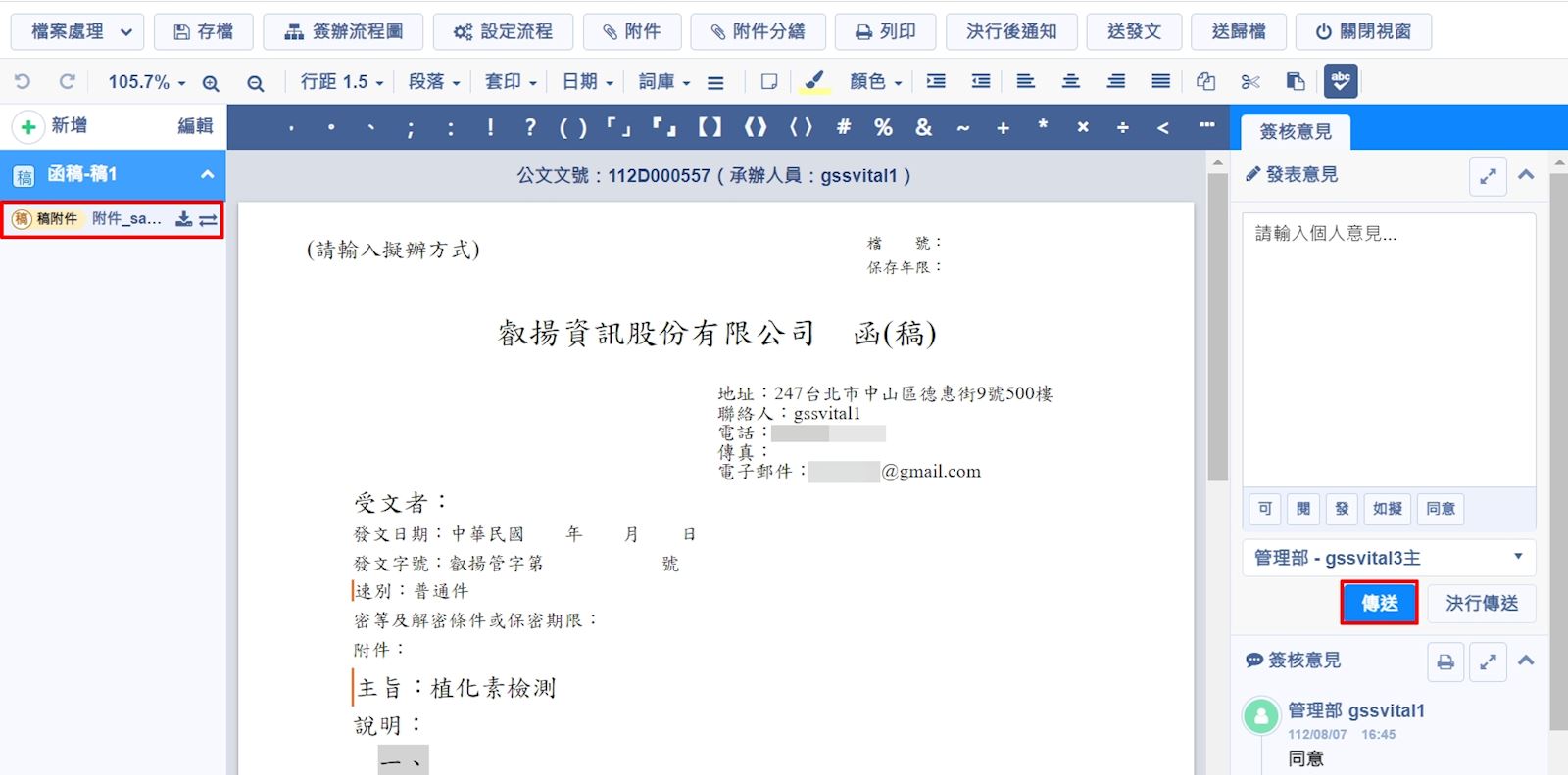 在畫面左方確認函稿有要夾帶的附件,按下【傳送】再次跑流程。