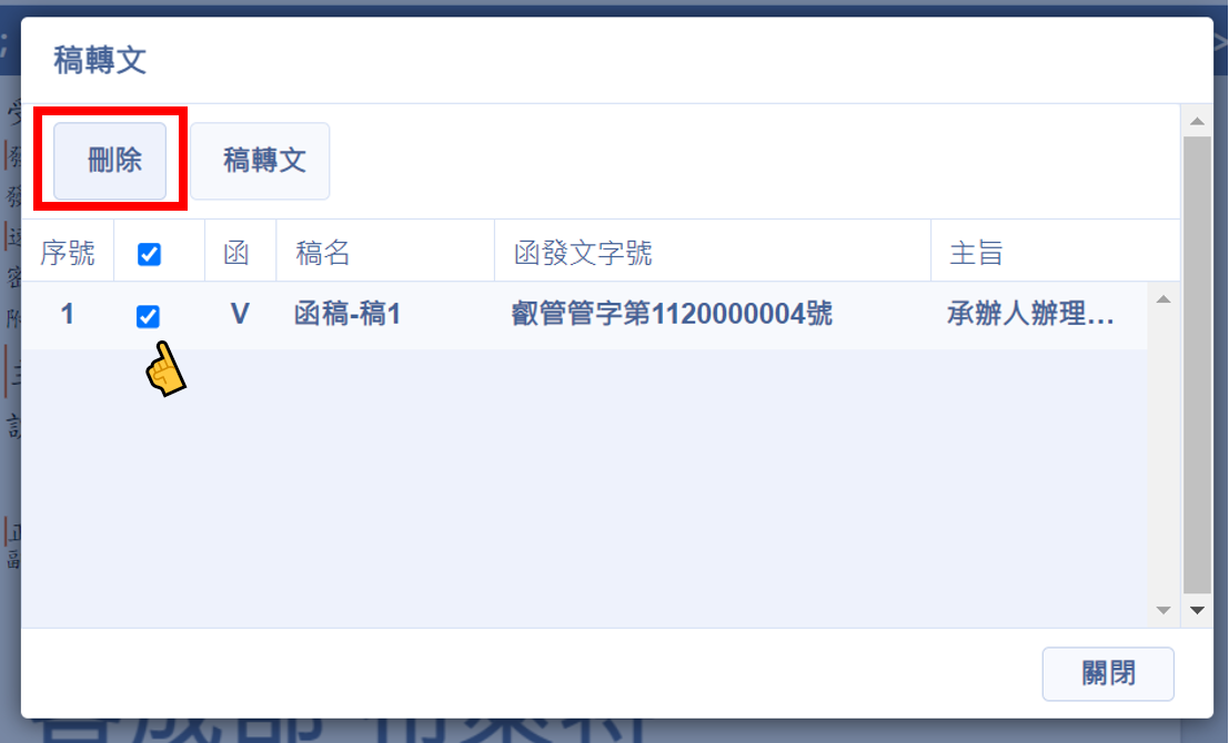 為了避免承辦人改錯,請發文人員在把公文退回給承辦前先把函刪除,承辦人員須取消決行以後才能編輯公文函稿,編輯以後請重新決行再送發文,發文人員待承辦人修改完公文後再重新稿轉文即可。