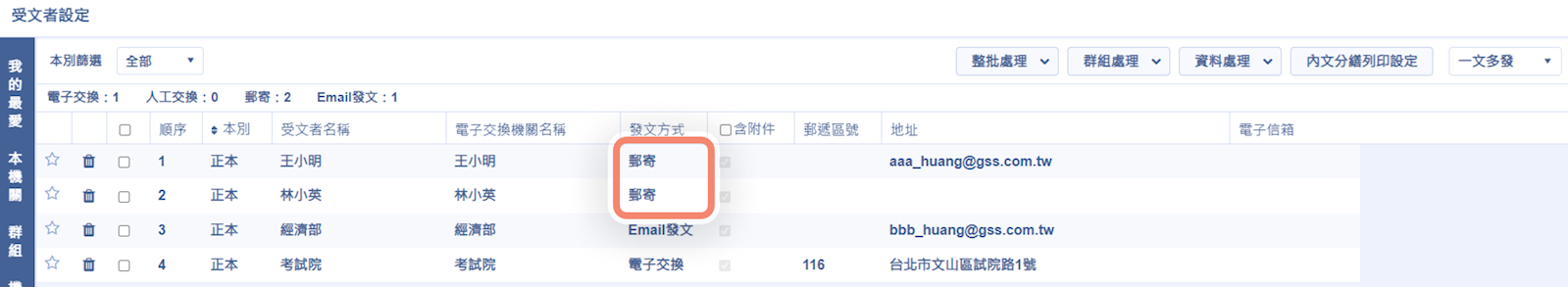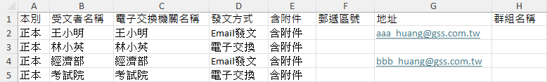 在以下情境中,匯入清單內「王小明」及「林小英」為非電子交換機關,但發文方式分別設定為「Email發文」及「電子交換」