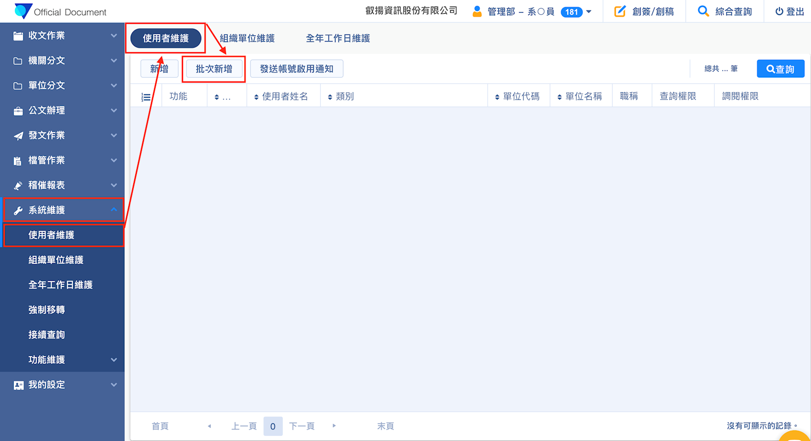 1.從左方列表選擇【系統維護】,點選【使用者維護】→【批次新增】
