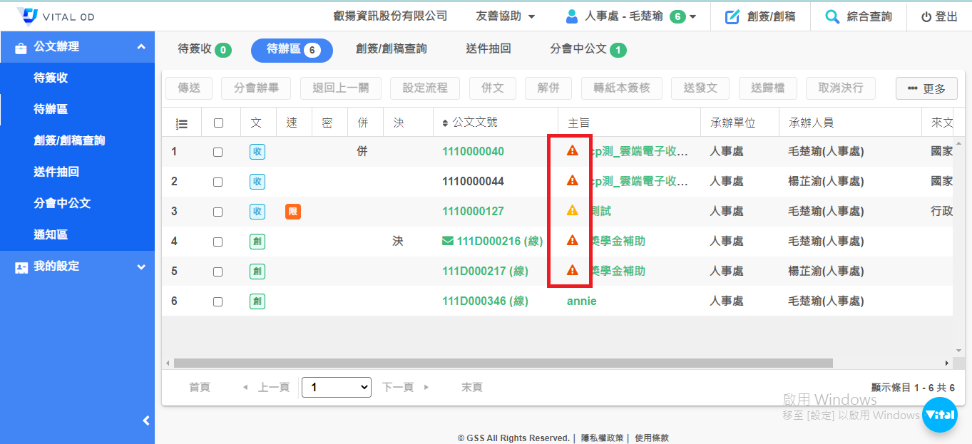 黃色驚嘆號:公文將在2天內逾期;紅色驚嘆號:公文已逾期。