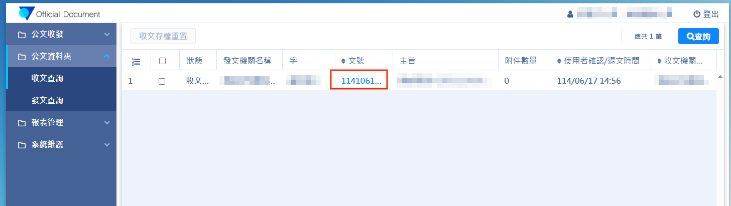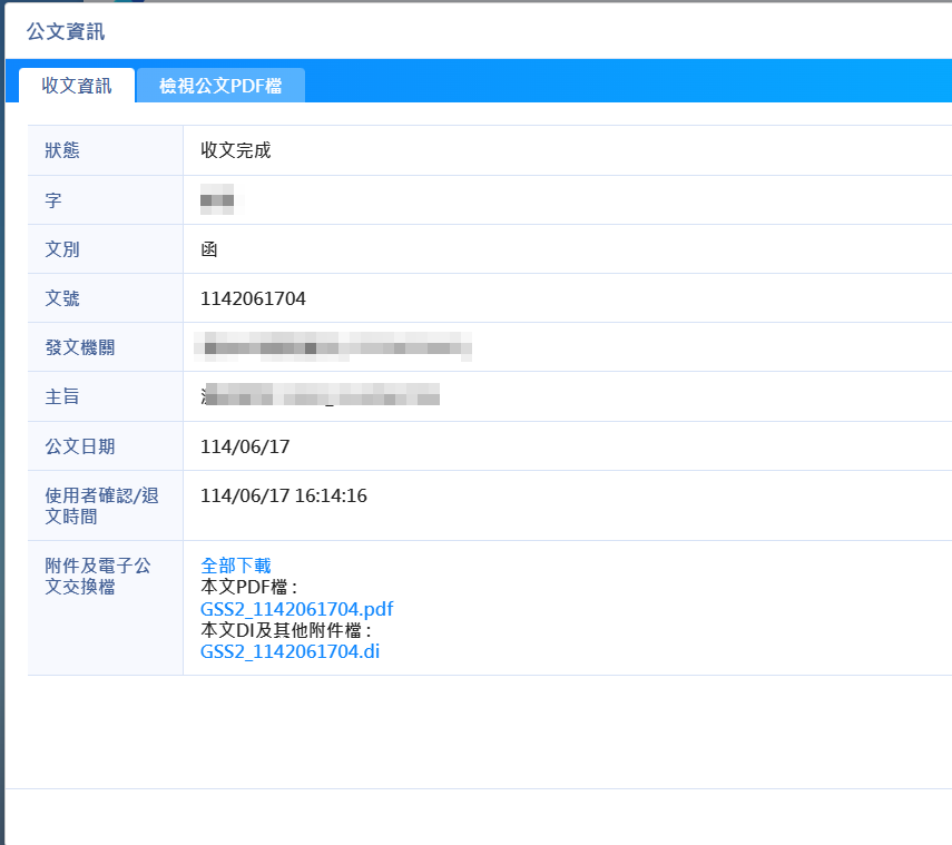 *此處也可查看是否有來文附件(除了本文檔案,本文檔案的檔名會顯示來文字號)。