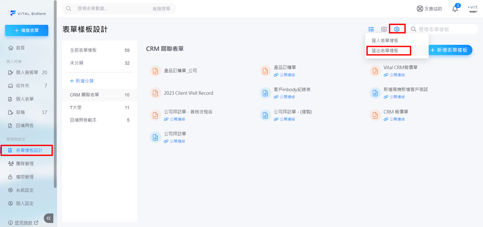 請至【表單樣板設計】,點選右上角【齒輪】>【匯出表單樣板】。