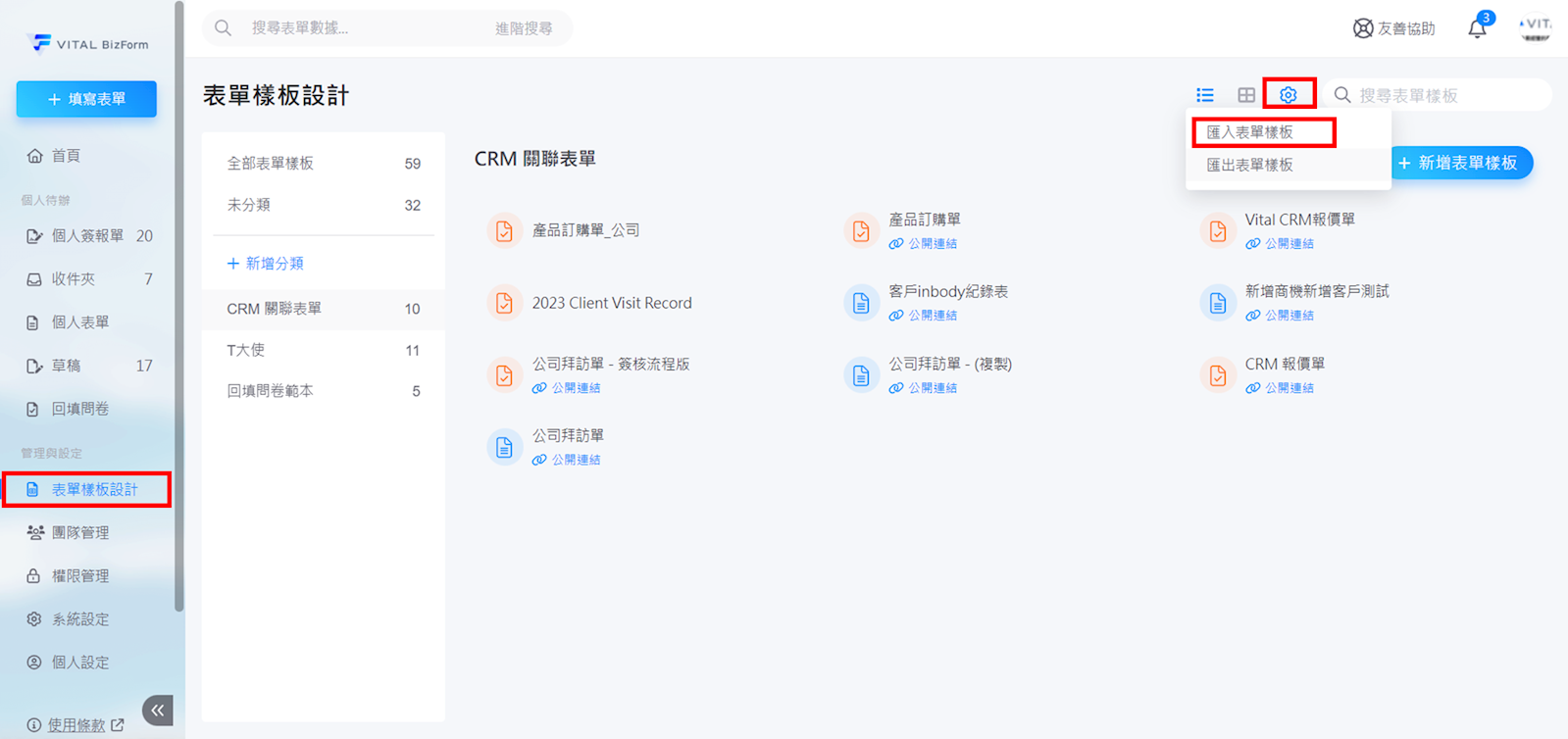 請至【表單樣板設計】,點選右上角【齒輪】>【匯入表單樣板】。