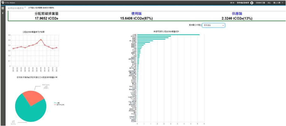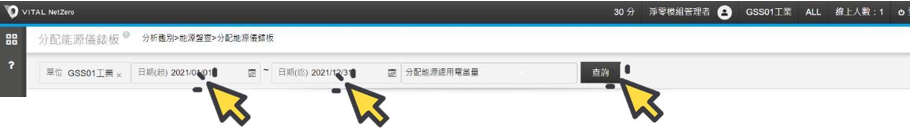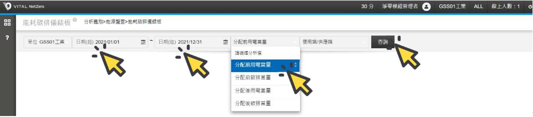 可設定時間範圍進行查詢。接續點選查看[分配前用電當量]、[分配前碳排當量] 、[分配後用電當量]或[分配後碳排當量]。