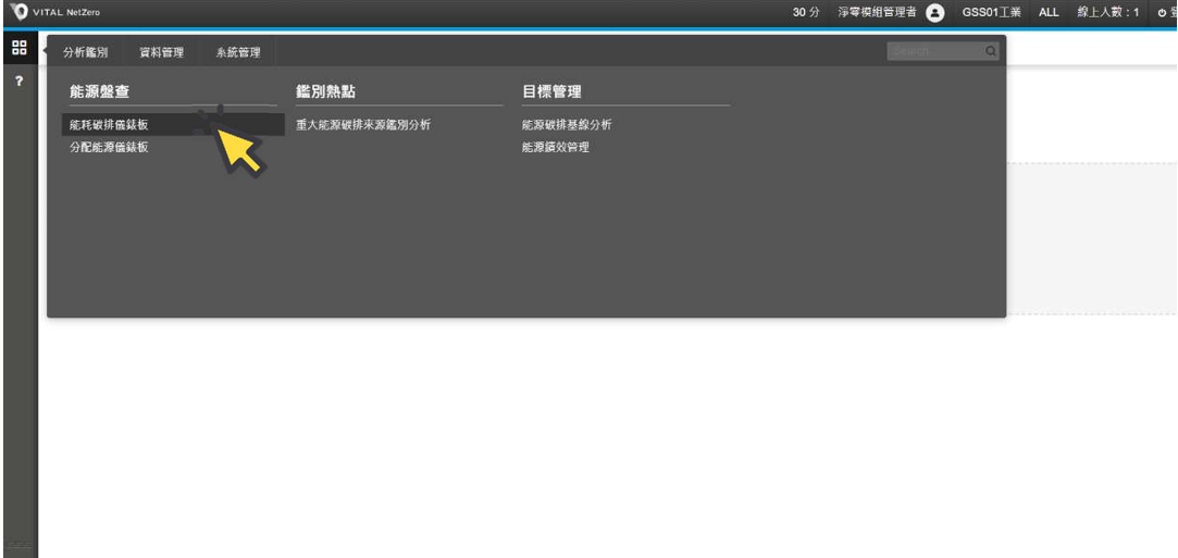 點選左上角[全站功能]選單 ,點選[分析鑑別],於[能源盤查]作業項下,點選[能耗盤查儀錶板]。