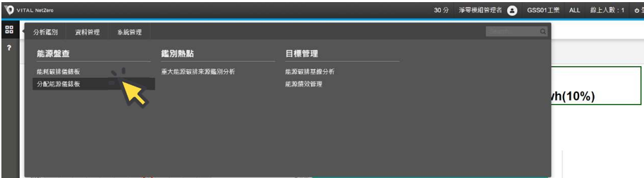 如果要進㇐步查看能源分配的儀錶板,點選左上角[全站功能]選單 ,點選[分析鑑別],於[能源盤查]作業項下,點選[分配能源儀錶板]。