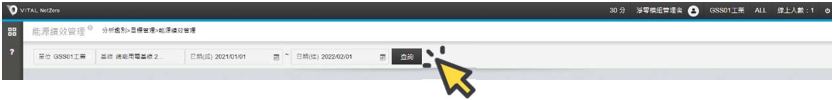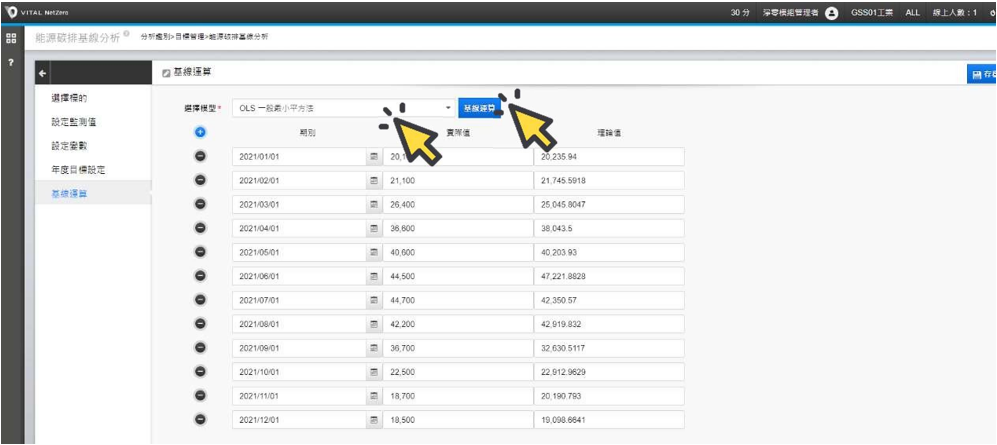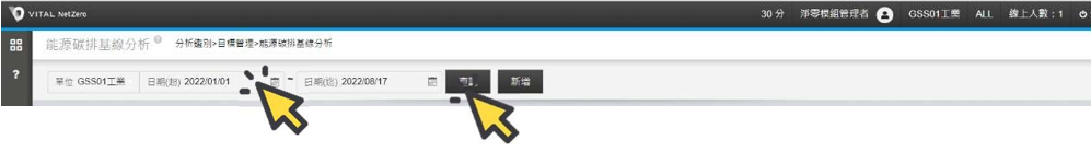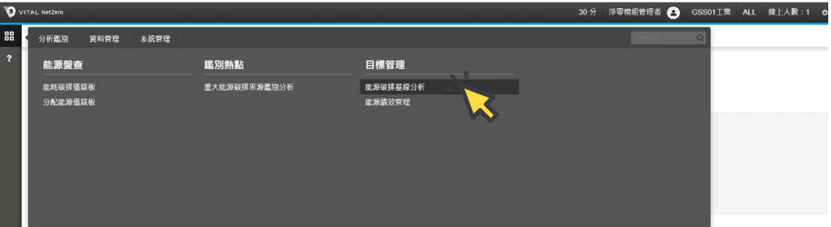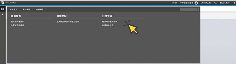 選單 ,點選[分析鑑別],於[目標管理]作業項下,點選[能源碳排基線分析]。