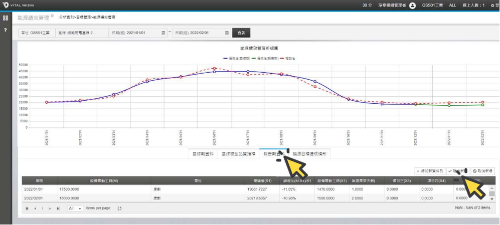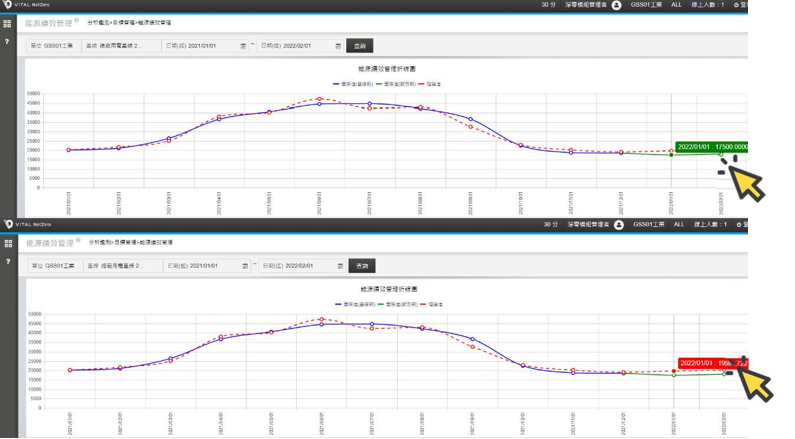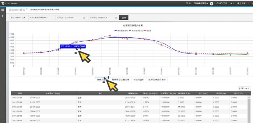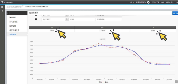 完成新增㇐列報告期資料後,畫面會顯示基線期數據曲線之後的報告期數據曲線, 綠色線代表報告期間監測值M 的實際值,紅色虛線代表回歸模型推算的理論值, 可相較觀察報告期間的能耗使用,相較於基線年同期的差距。