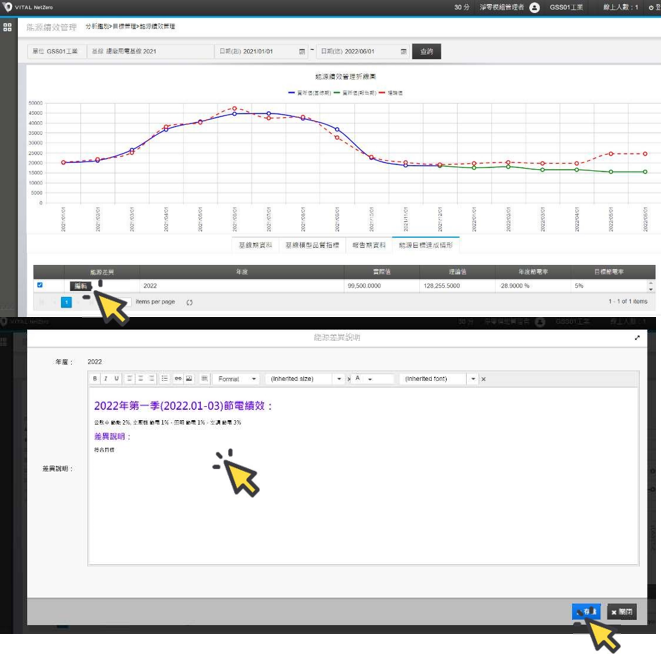 移動到畫面下方,點選最右側[能源目標達成情形]頁籤,可以查看基線期之後的各期實際數據以及相較基線的理論值差異計算,以及比對年度目標,續點選左下方年度目標資料列左側的[編輯]按鍵,可編寫節能減碳改善前與改善後的差異說明,並進行持續監督與採取矯正措施。