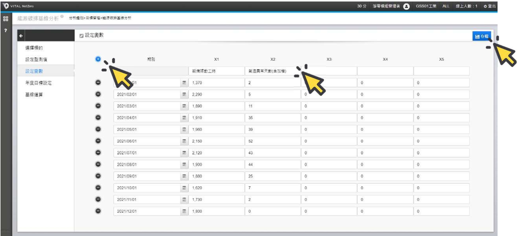 續點選[設定變數],輸入此基線在回歸分析時所需要的變因或是影響因子 Xn 的項目名稱與各期對應數據。例如: X1 為設備嫁動工時,X2 為氣溫異常天數。