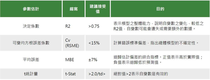 選定回歸模型,按下[基線運算],即可查看各期回歸模型推算結果的”理論值” 與誤差指標,包含 R 平方(R squared)判定係數、MBE(Mean Biased Error)配對值偏差以及 CV(Coefficient of Variance)變異係數或標準差值等等。